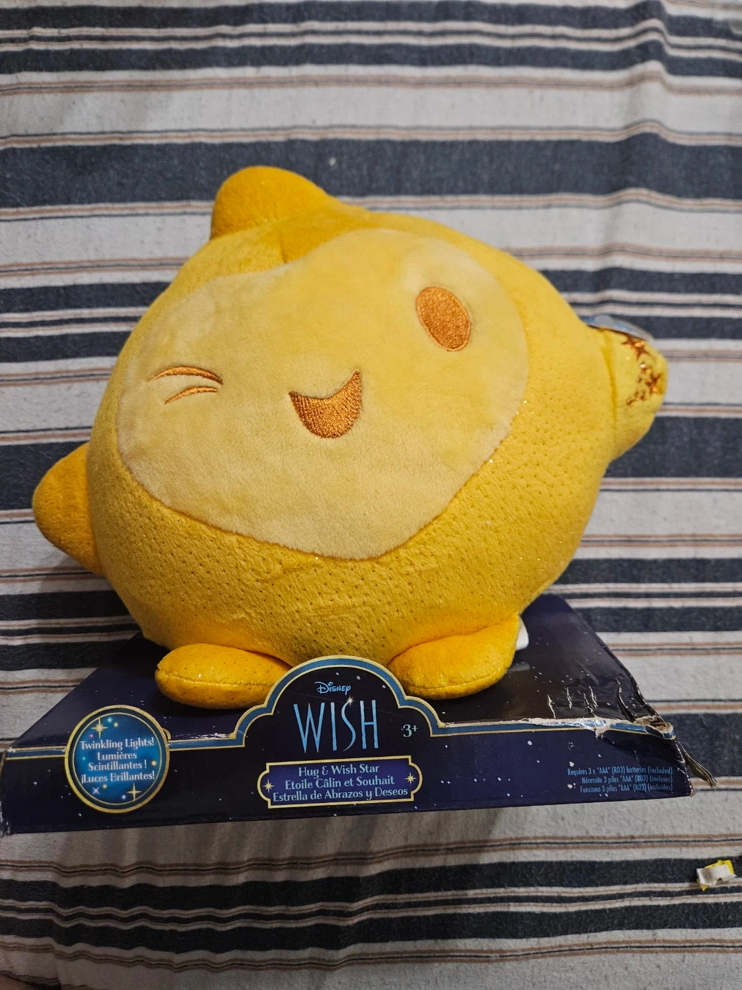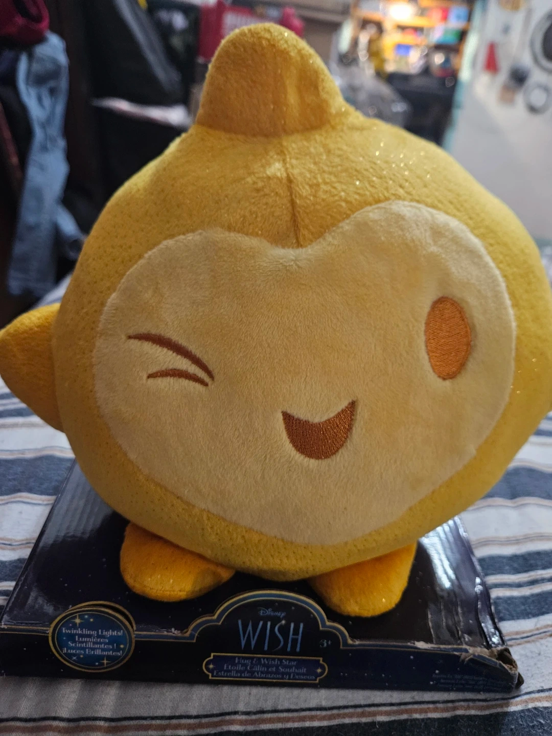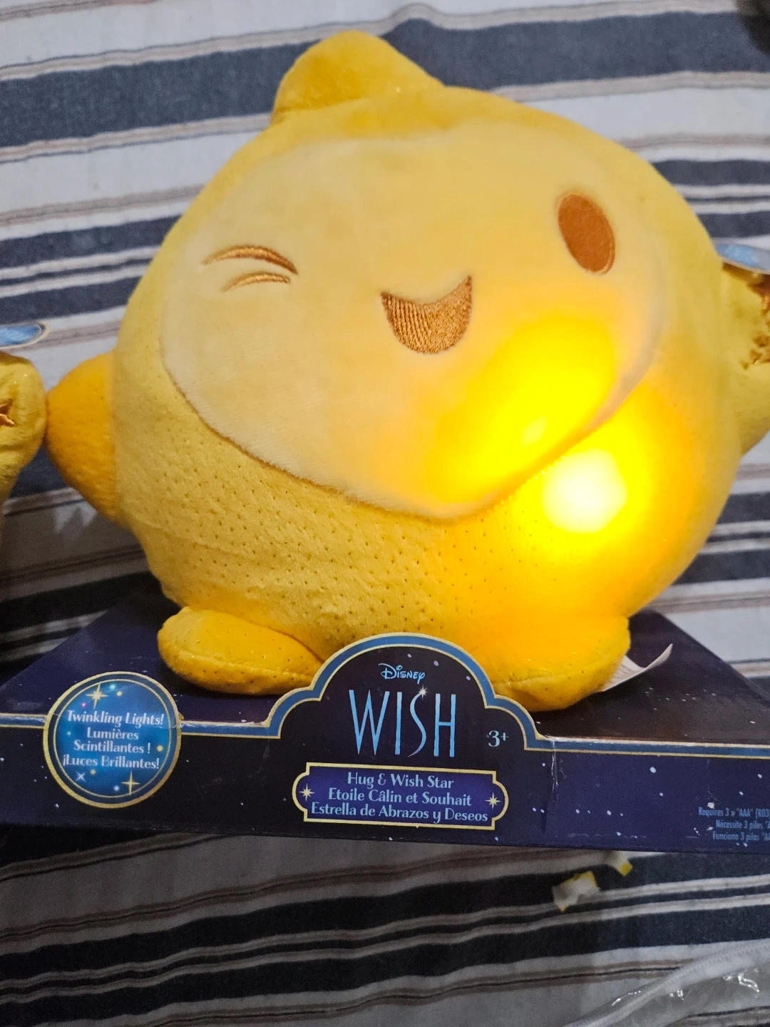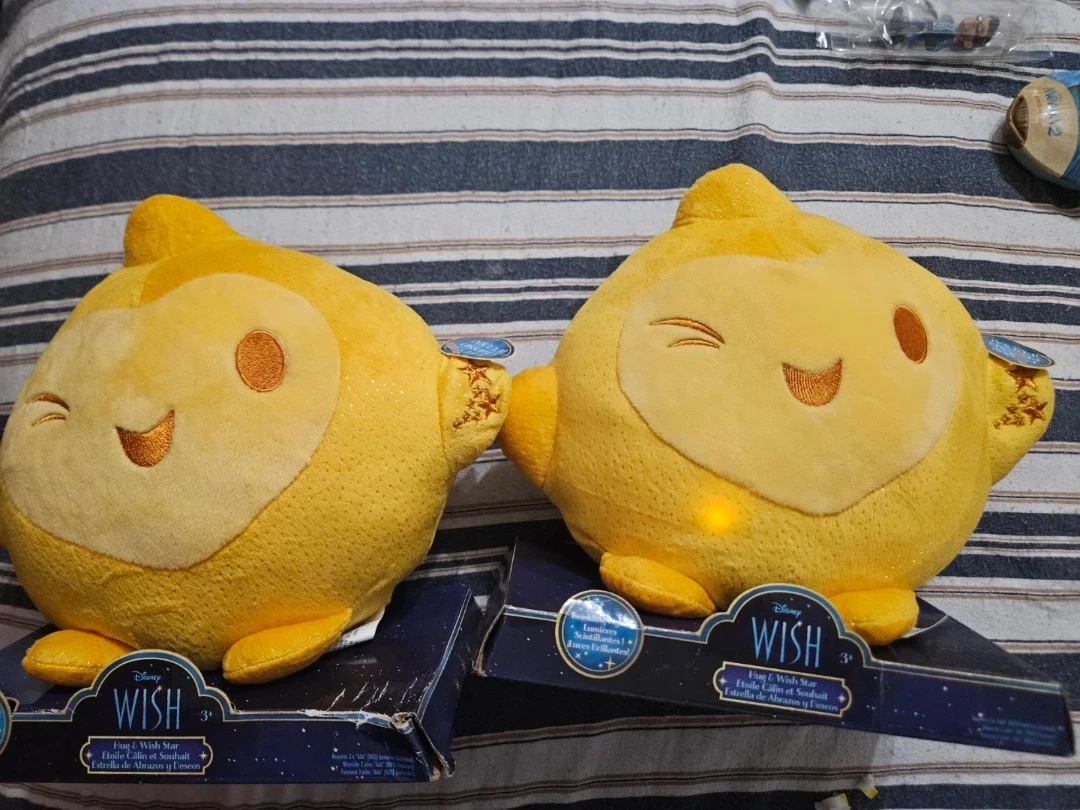 This is a Disney Wish Star plush toy. It features twinkling lights for a magical effect. Recommended for ages 3 and up.