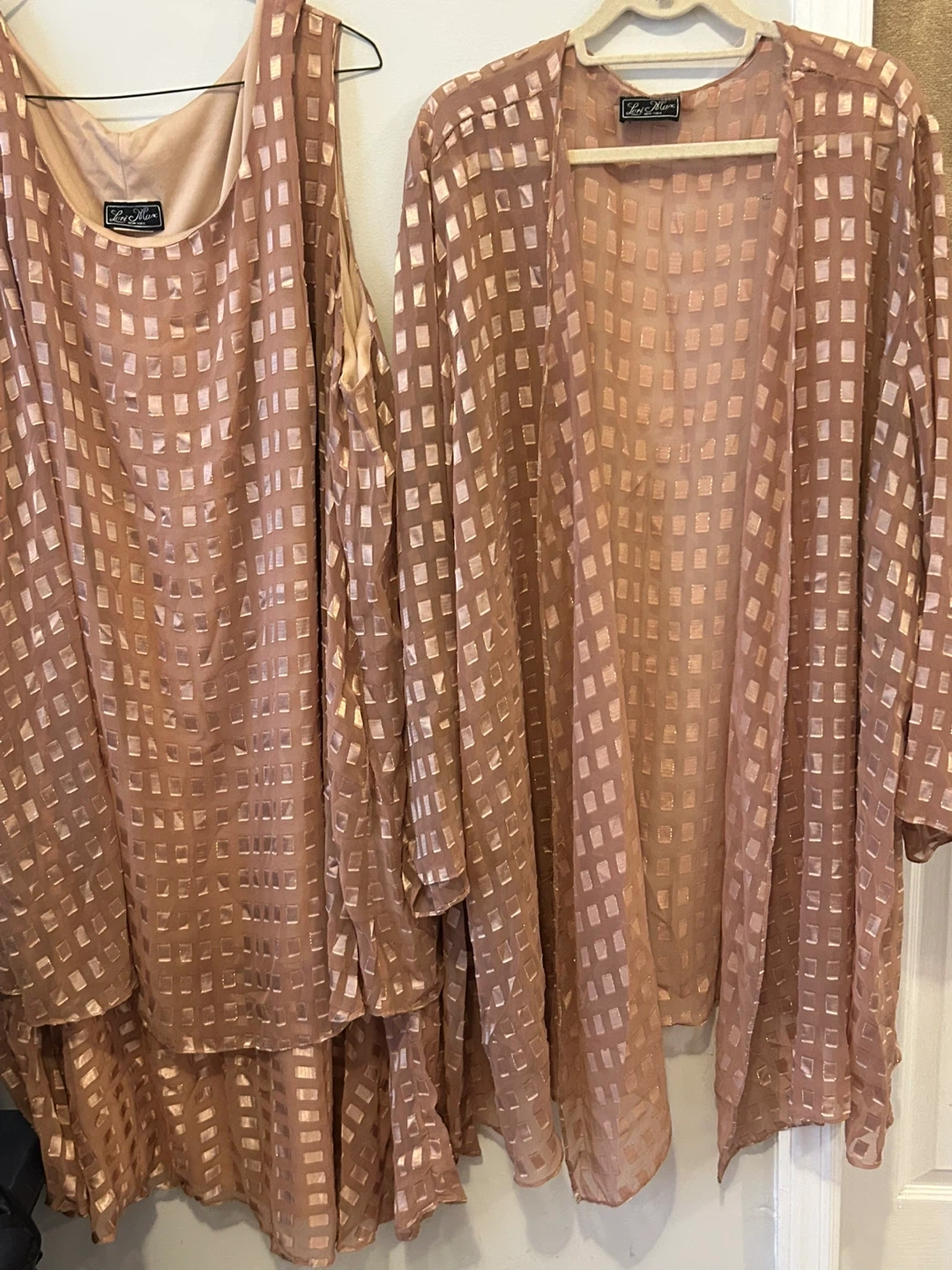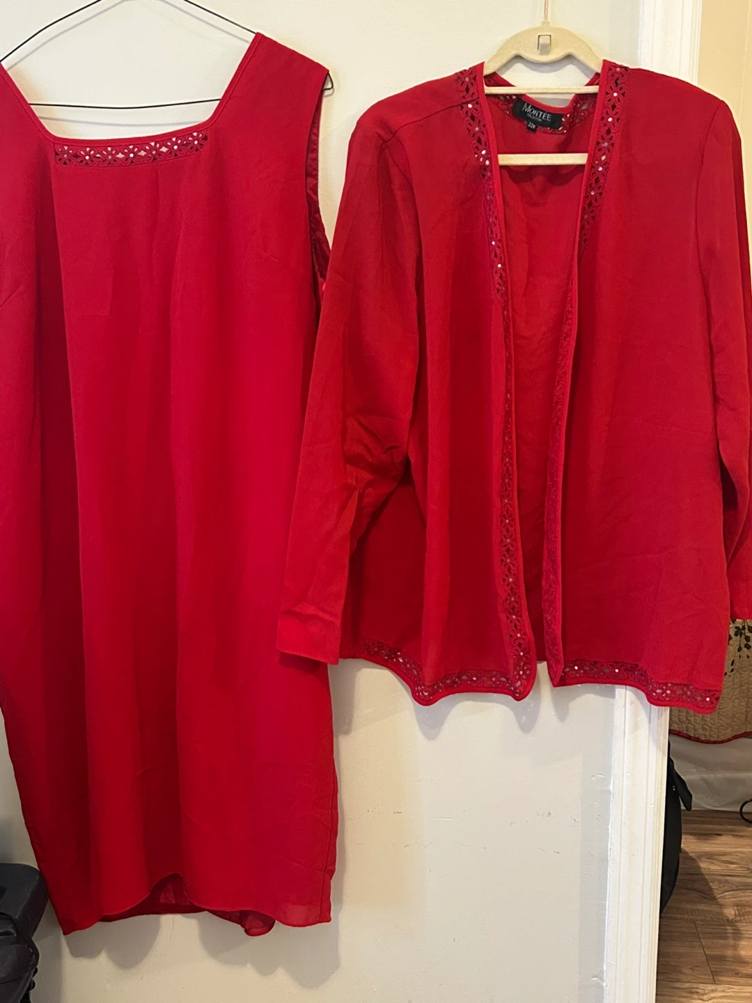 This elegant two-piece set includes a sleeveless red dress and a matching long-sleeved cardigan. Both pieces feature a decorative sequined trim. It's perfect for a dressy occasion!
