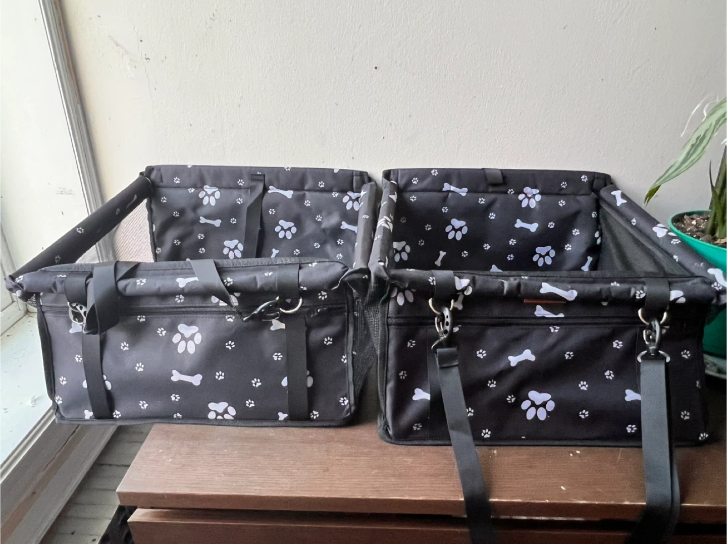 Black pet car seat carrier with paw and bone print. Features mesh sides and secure straps. It's designed for safe travel with your pet!