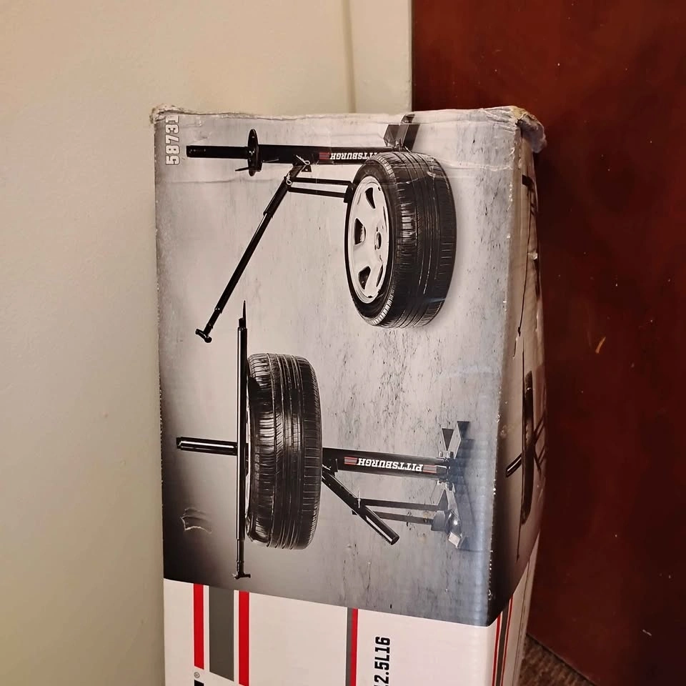 Brand new Pittsburgh portable tire changer, still in the box and never used. It handles tires from 8 inches up to light truck size (8" x 16"), including flotation tires up to size 12.5L16. Features all steel construction and a predrilled base for secure installation. Designed to protect inner tubes.