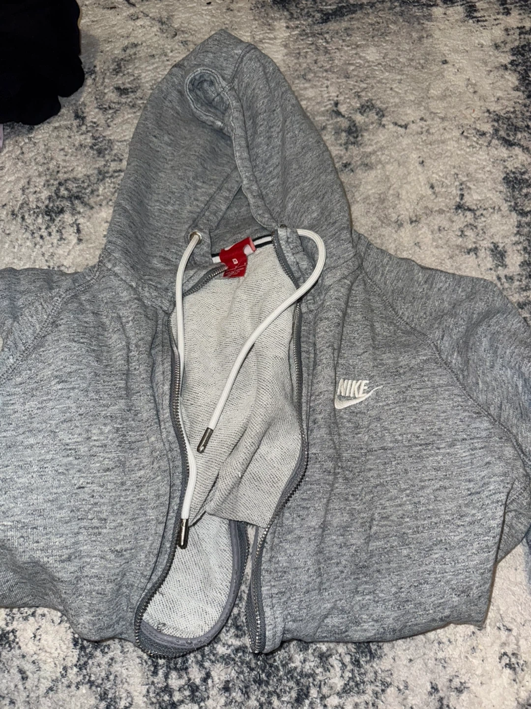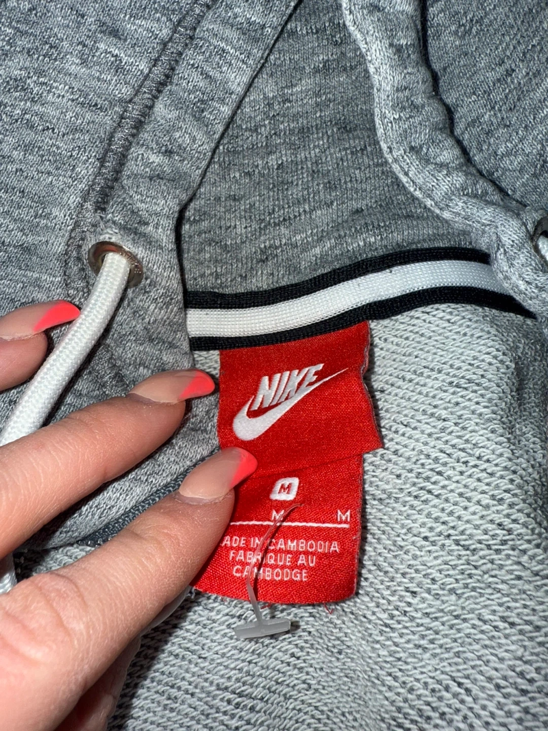 A grey zip-up hoodie from Nike. It's a size medium. Made in Cambodia. Great for everyday wear!
