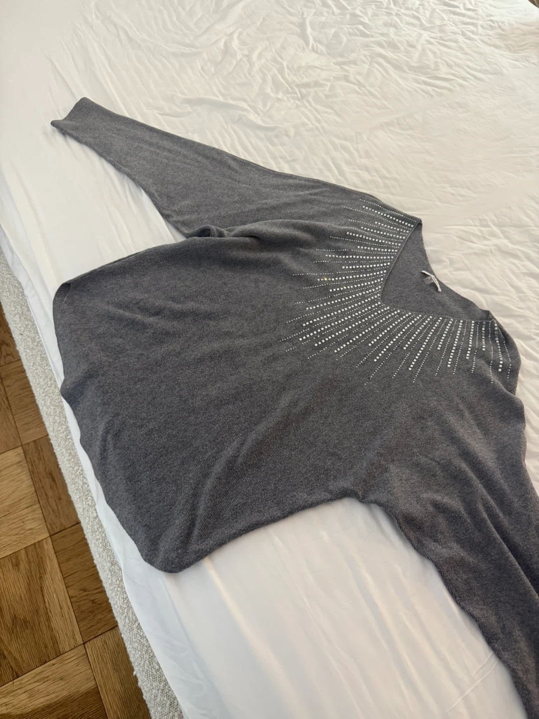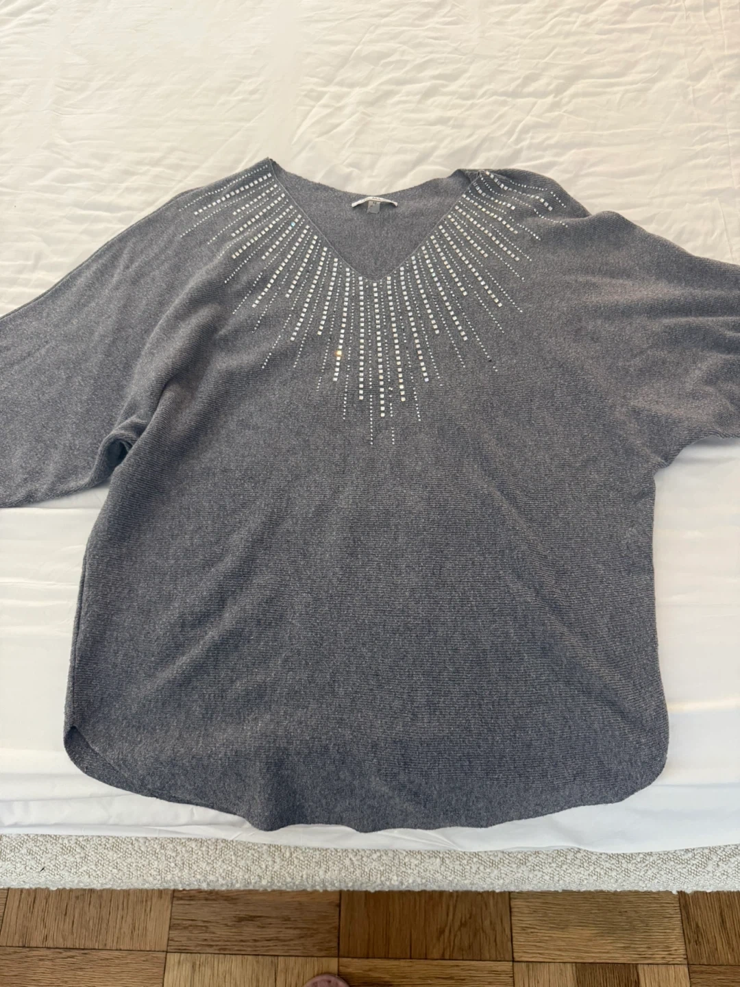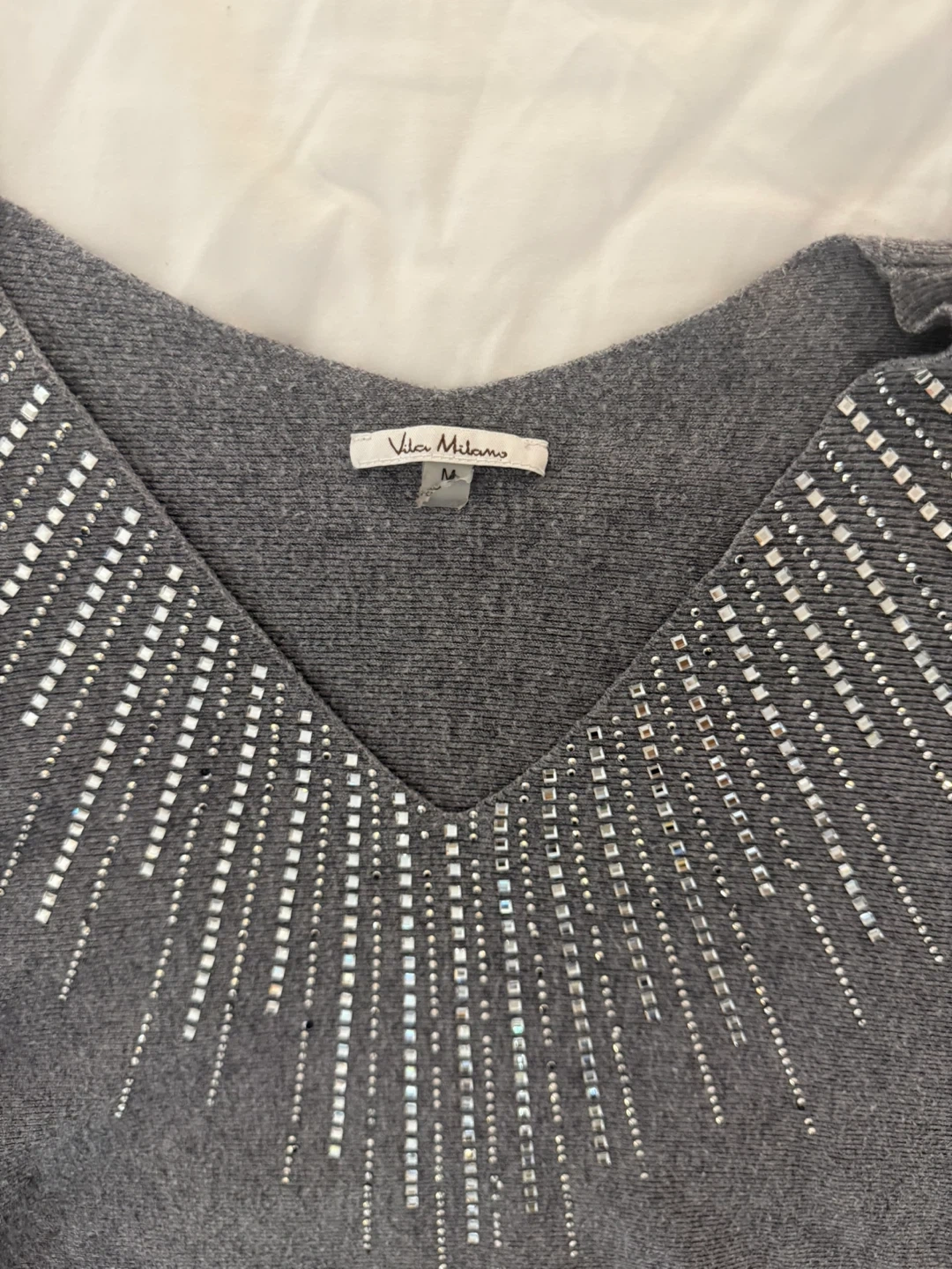 10Selling a gently used Via Milano sweater in size medium. It's a stylish gray color with beautiful embellishments around the neckline. Perfect for adding a touch of sparkle to your wardrobe!