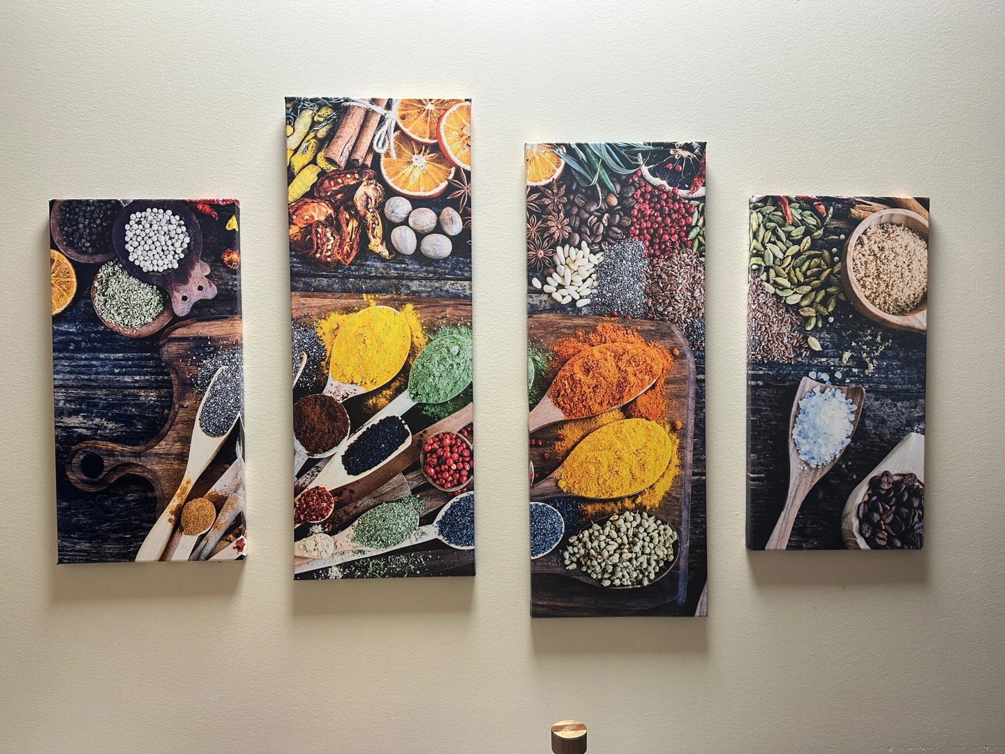 60Liven up your kitchen or dining area with this bold, colorful set of four canvas prints showcasing spices, herbs, and ingredients. Perfect for food lovers, chefs, and anyone wanting to add warmth and personality to their cooking space! Set includes: 4 separate canvases Size: Each panel approx. 12" x 20" (estimate) Condition: Excellent – no marks, fading, or tears Style: Modern food photography, rich tones, works with farmhouse, rustic, or modern kitchen décor Easy to hang: Lightweight, ready for mounting