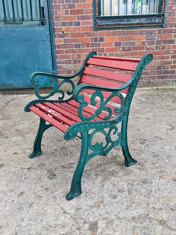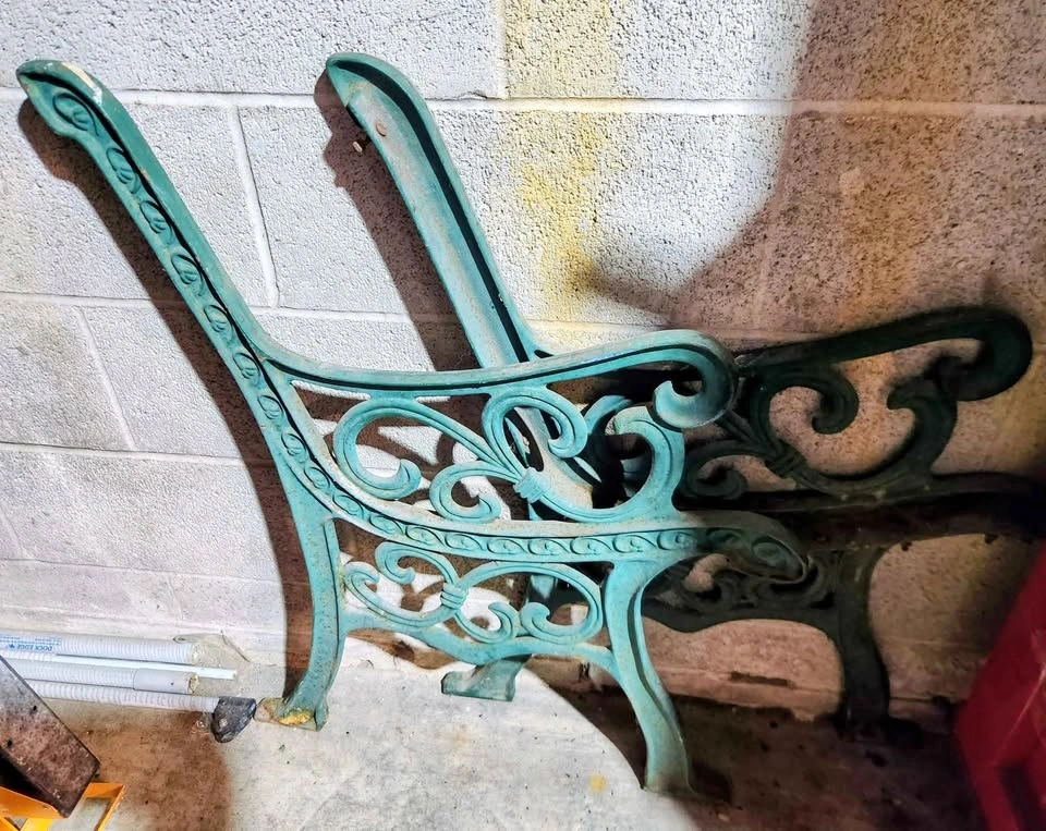 77A great quality set of two garden chair/bench ends. Heavy decorative green painted cast iron ends ready for you choice of slats size. Very good condition with some age related wear. English, late 20th century. Local pickup only due to weight. Any reasonable offers accepted.