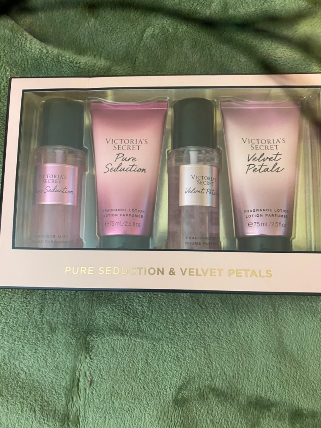 65I'm selling a Victoria's Secret set including Pure Seduction and Velvet Petals! This set includes fragrance mist and fragrance lotion. Each bottle contains 75 mL / 2.5 fl oz