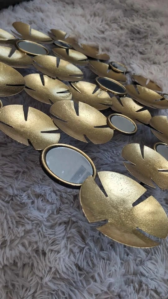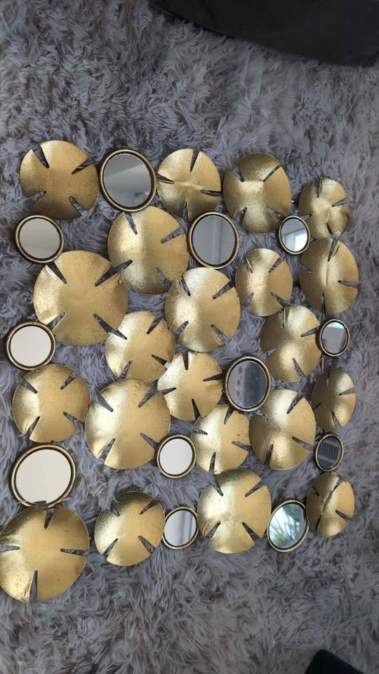Beautiful statement piece with layered gold discs and mirror details. Adds warmth and a luxe touch to any room. Excellent condition, lightweight and easy to hang.
