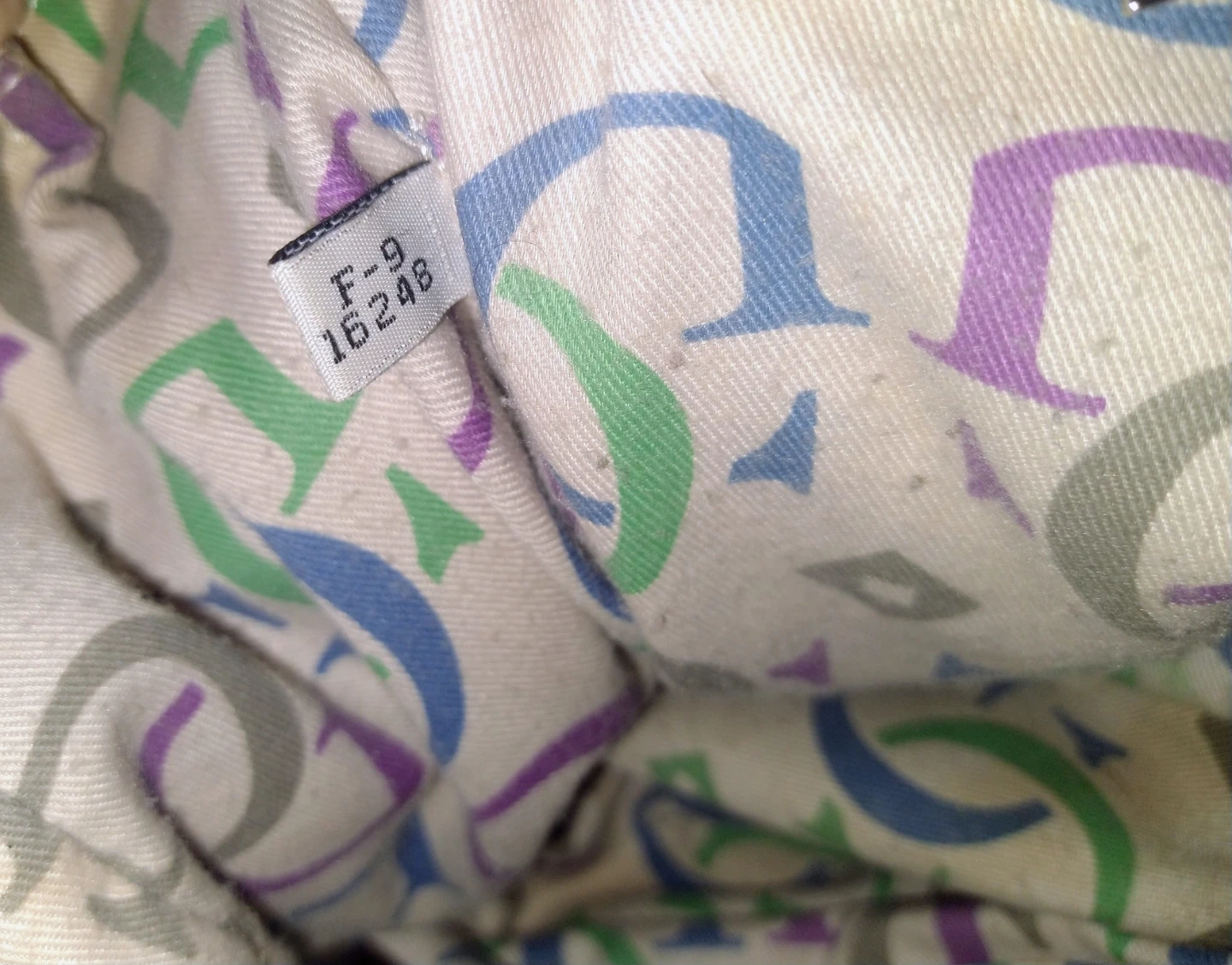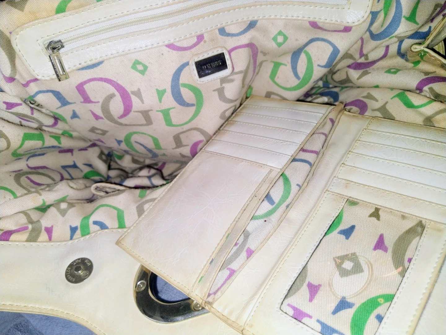Guess monogram hand bag in cream/white. Inside Features monogram pattern in green, purple and blue. Features stylish buckle details and textured design. Perfect for any outfit.