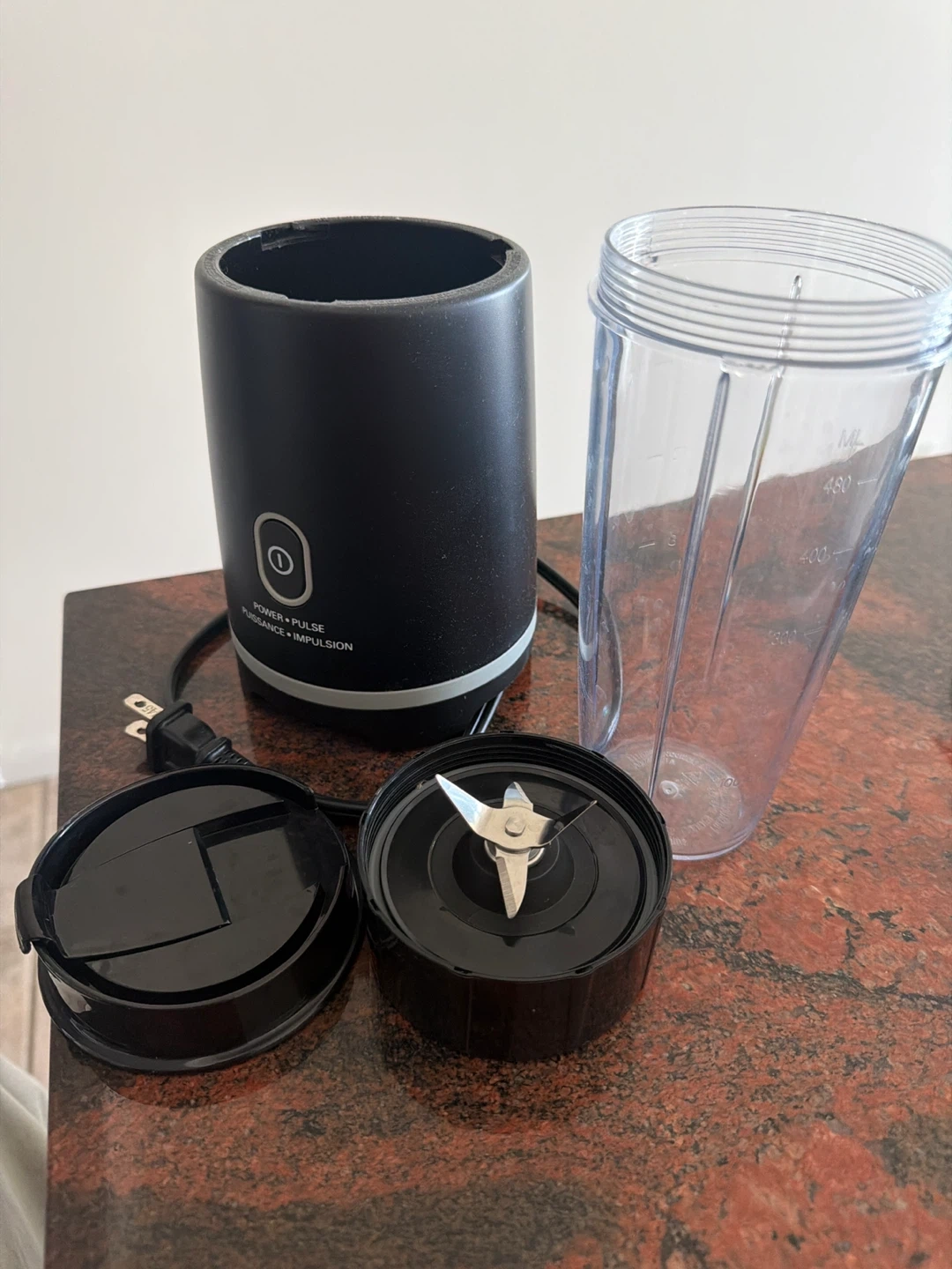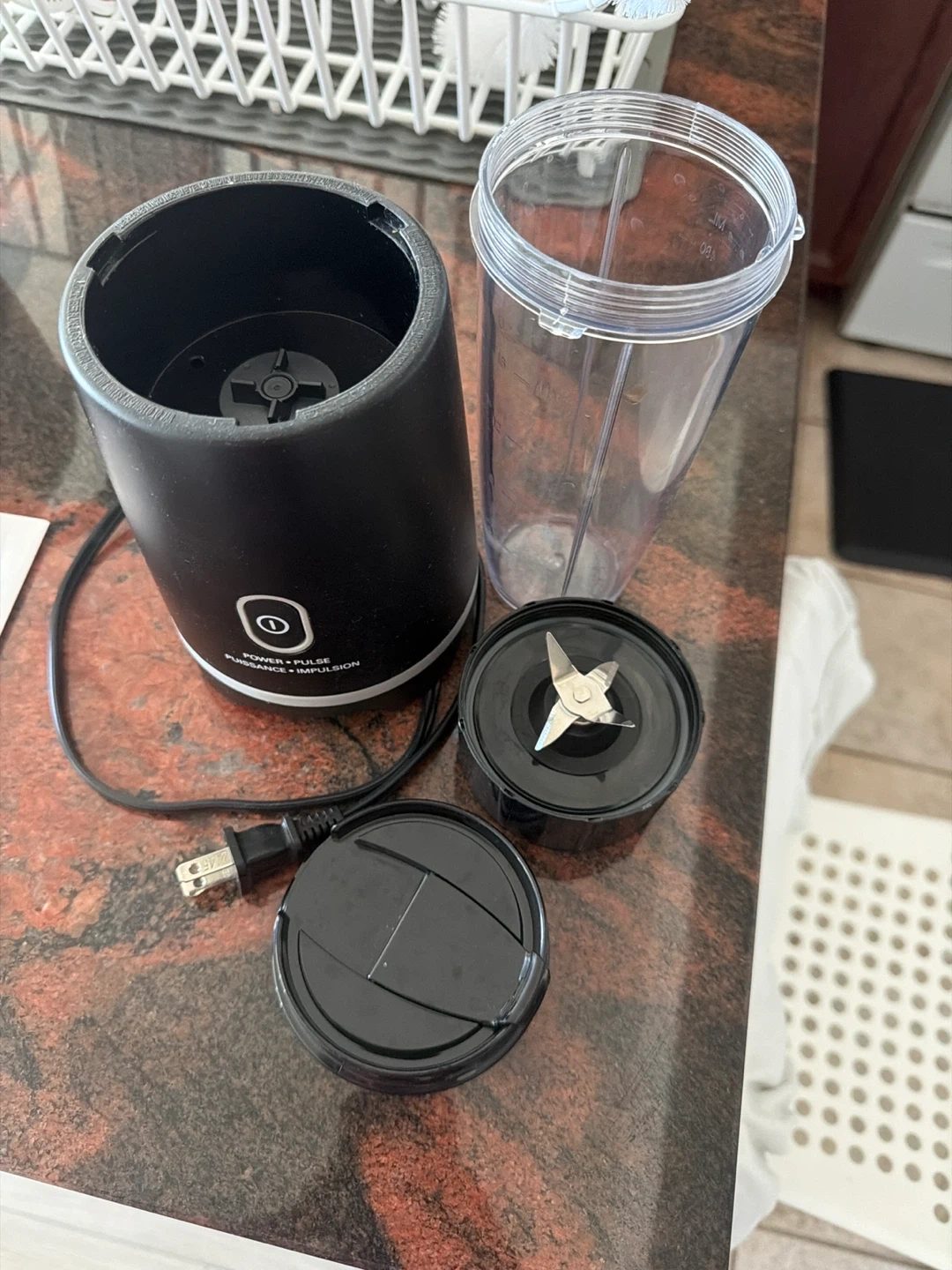 This is a personal blender set. It's black with a clear blending cup. Includes the blending base, blade assembly, cup, and lid. Perfect for quick smoothies!