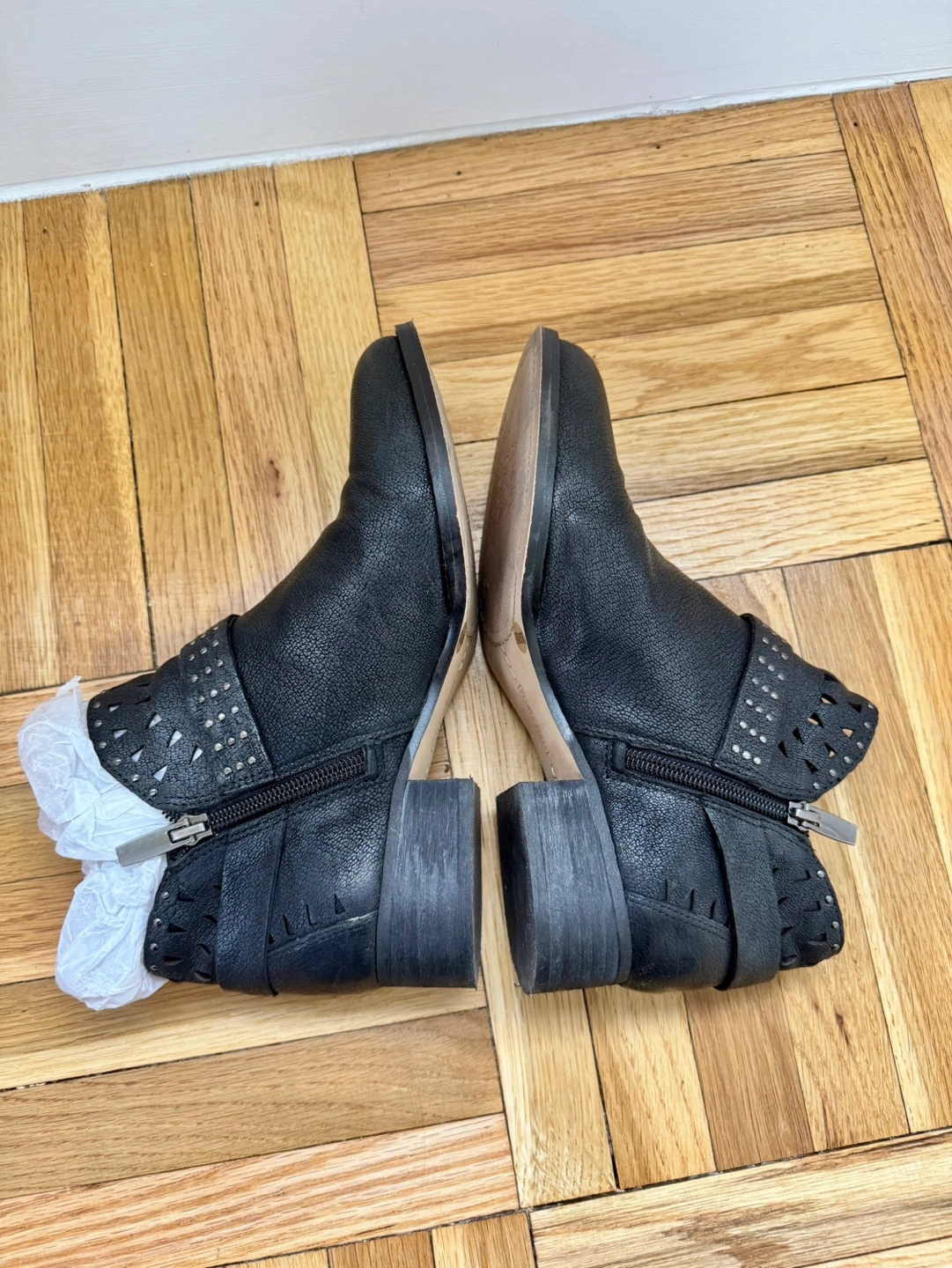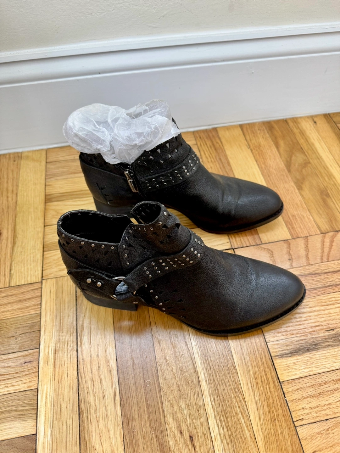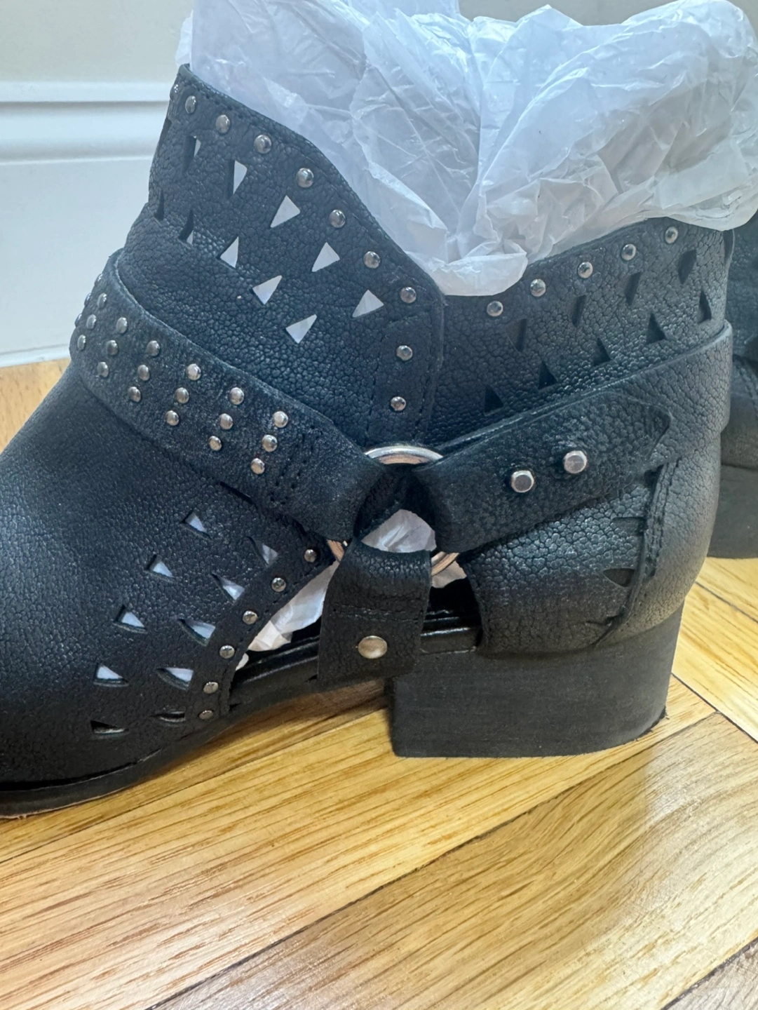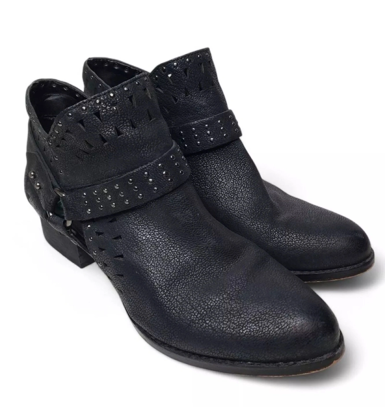 Pre-owned in great condition. Casual black leather bootie with harness, cutout and stud detail. Comes with original Vince Camuto box. Size: 6.5M Heel: 1.5 inches Pickup is on 72nd and 1st in Manhattan. Preference given to whoever schedules pickup first.