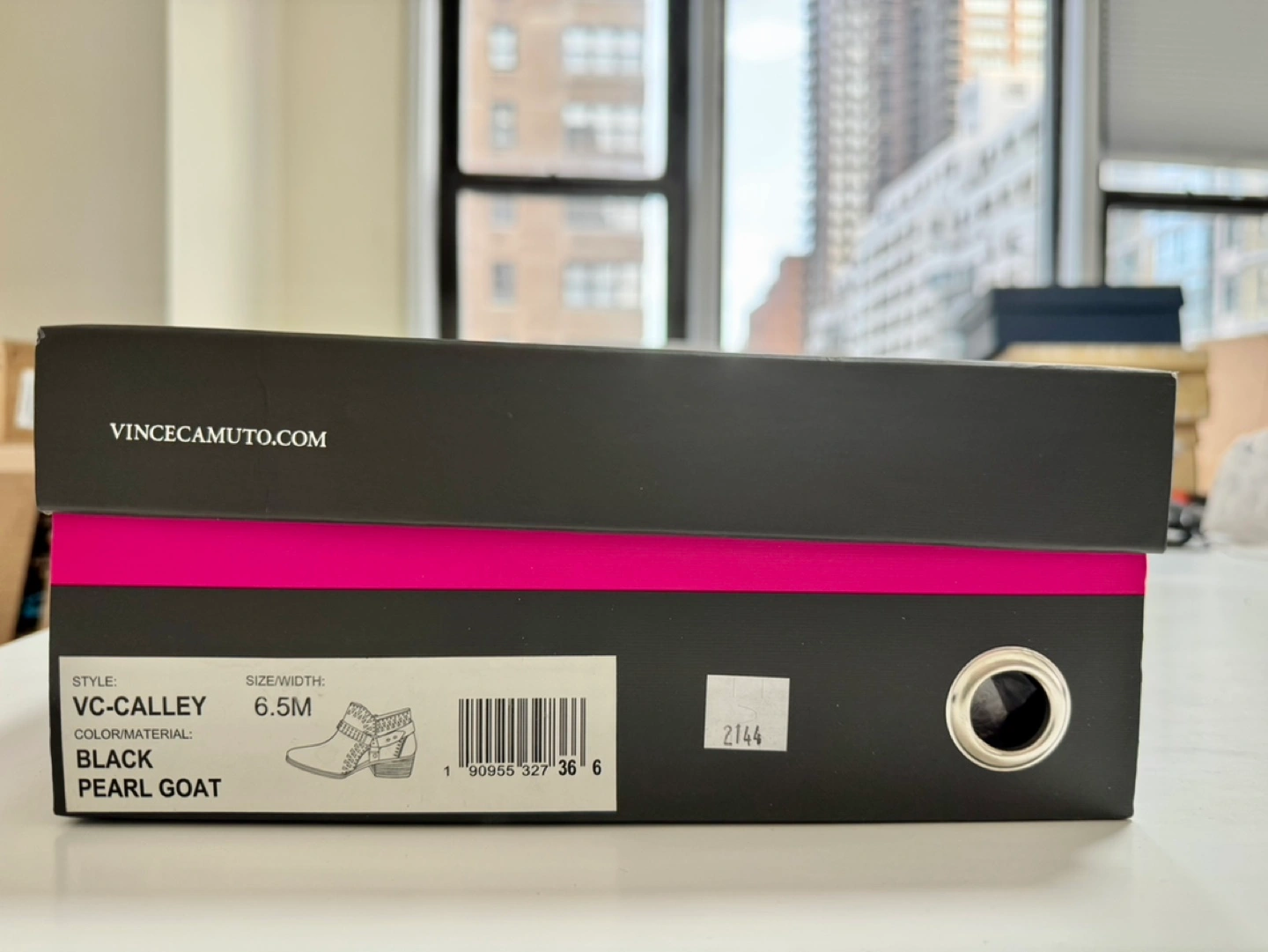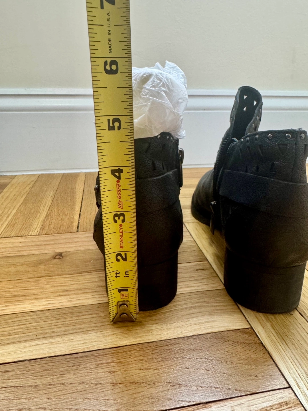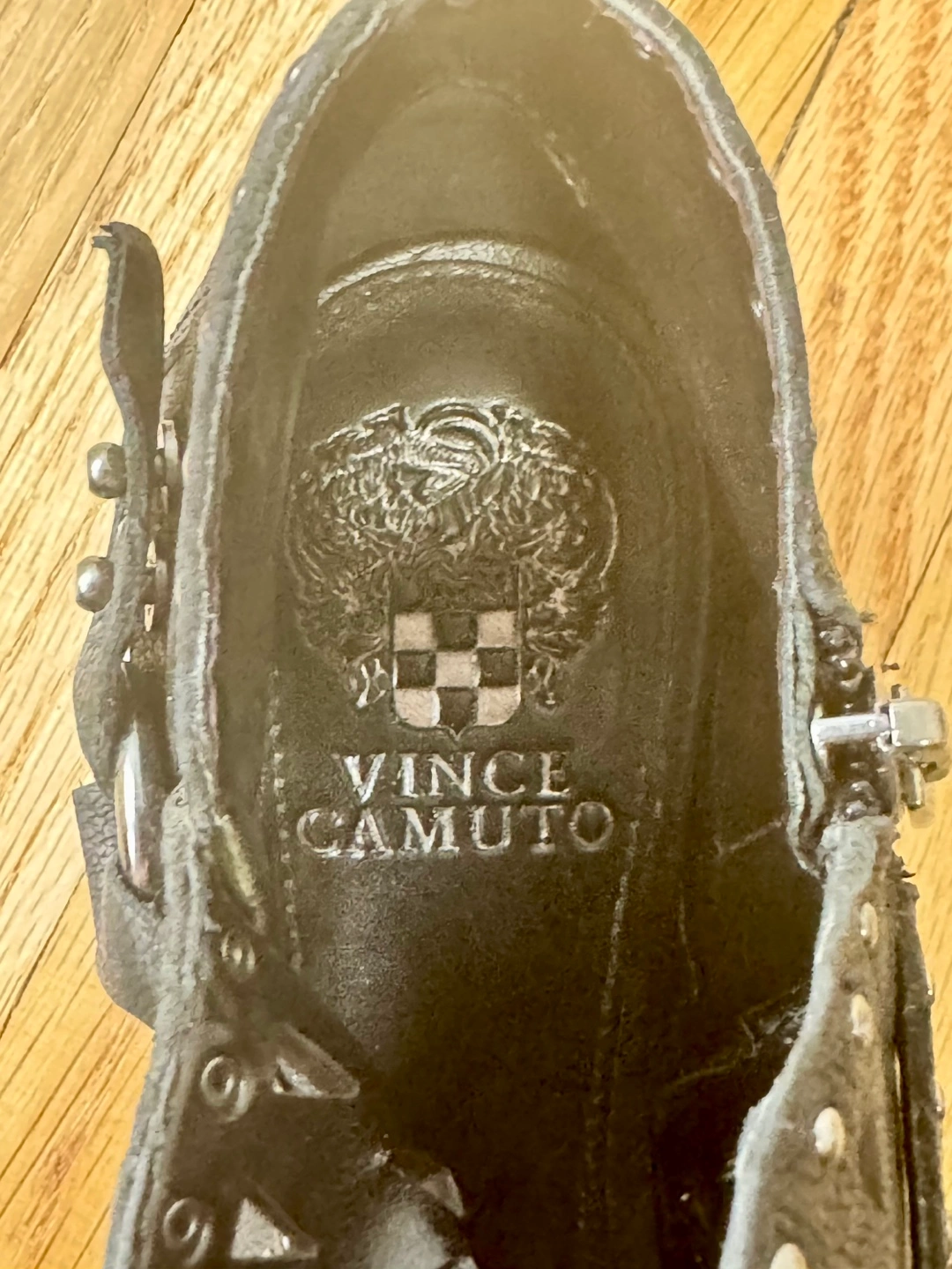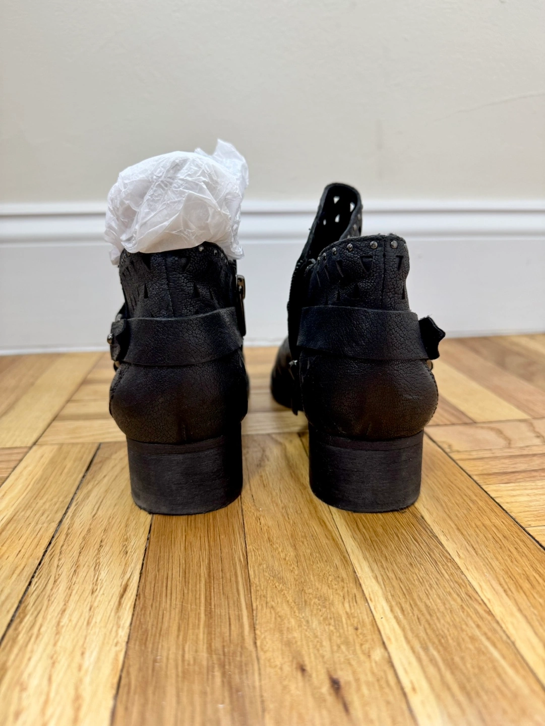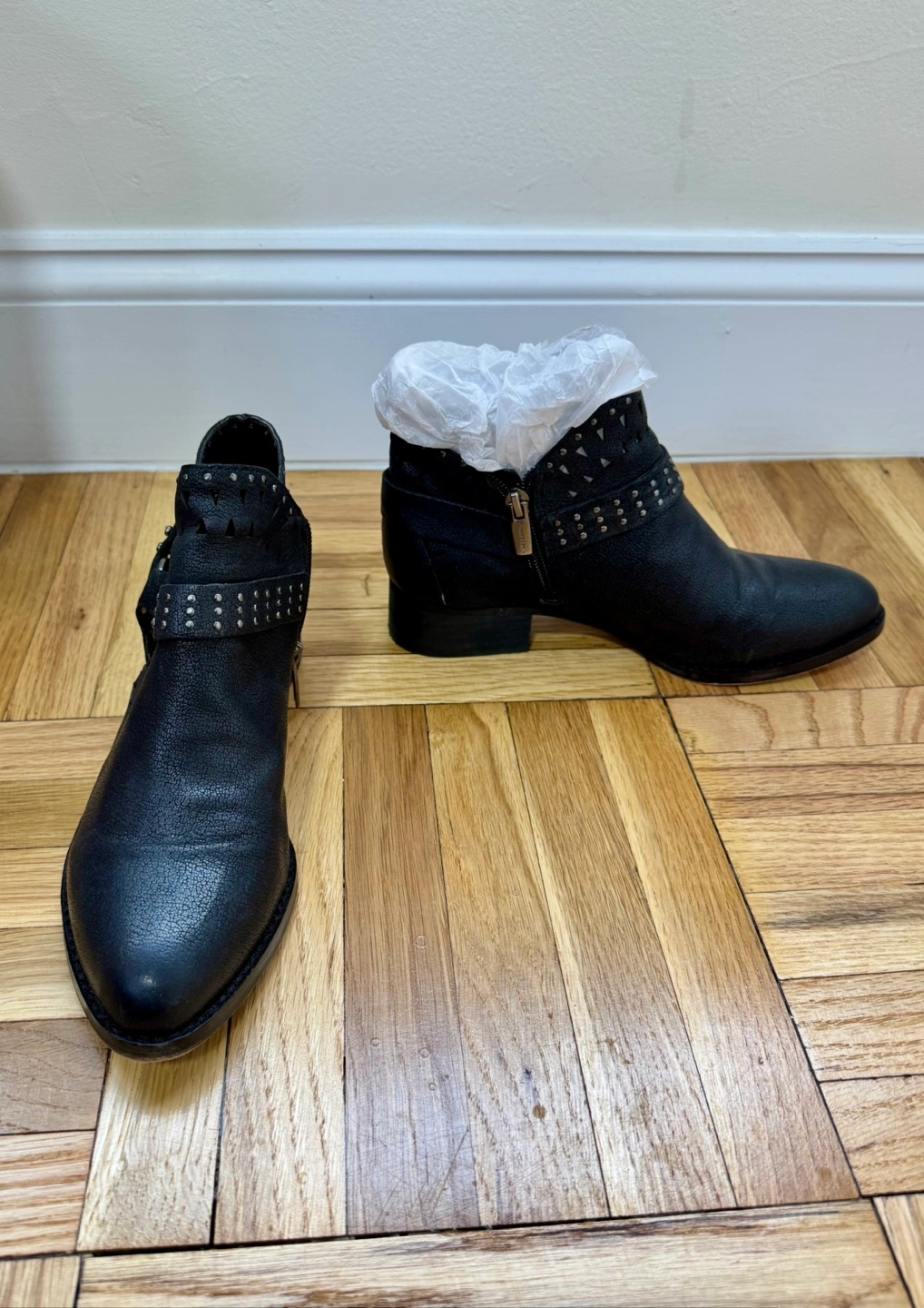 Pre-owned in great condition. Casual black leather bootie with harness, cutout and stud detail. Comes with original Vince Camuto box. Size: 6.5M Heel: 1.5 inches Pickup is on 72nd and 1st in Manhattan. Preference given to whoever schedules pickup first.