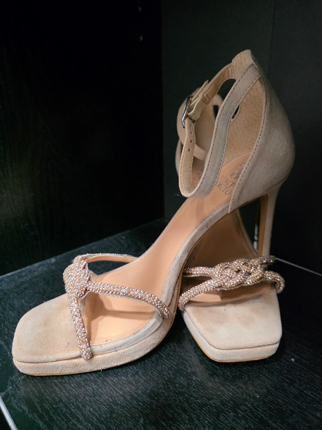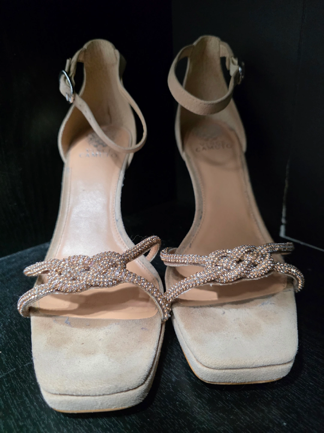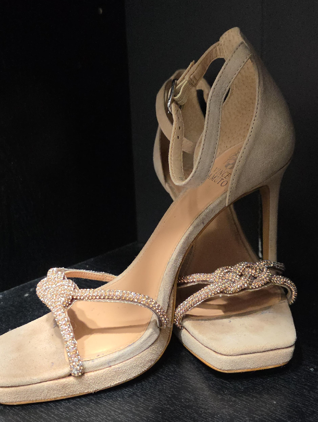 15Selling a pair of Vince Camuto heels in a neutral color. They feature a delicate knot detail with rhinestones across the toes and an ankle strap. Size 9