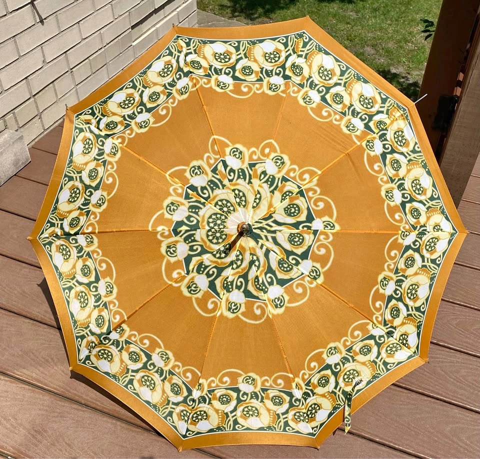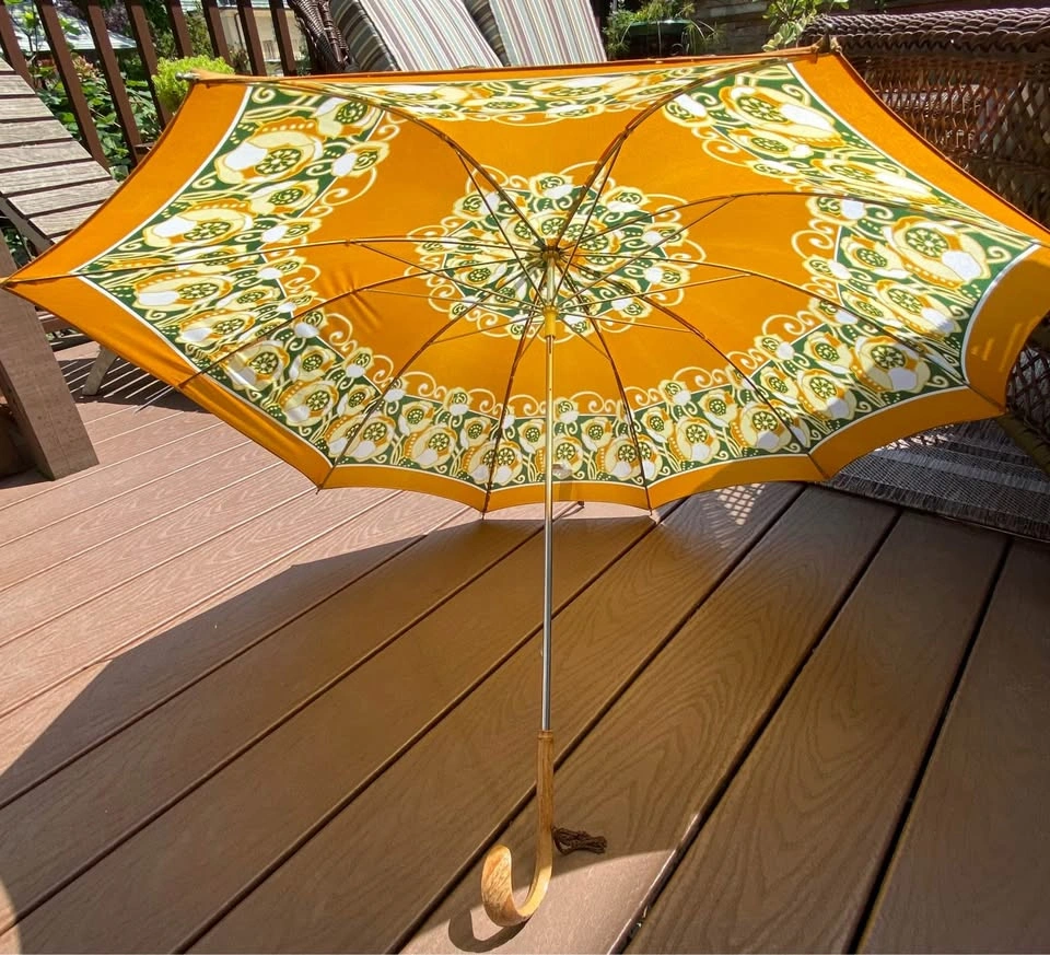 Vintage ‘70s (possibly ‘60s) umbrella. Fabric is great - no rotting, holes or tears. One spoke is detached from the end, but can be sewed back on. See second and third photo. Four of the little round nubs at the end of the spokes are missing. Opens and closes smoothly. Really nice wood handle. Also has case. Pick up in Beverly.