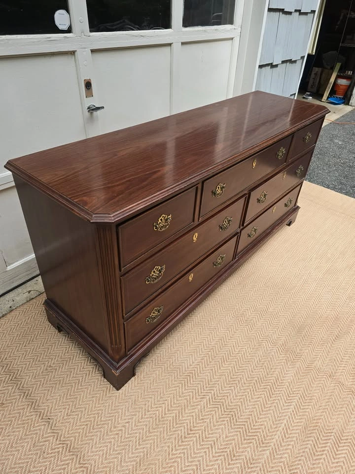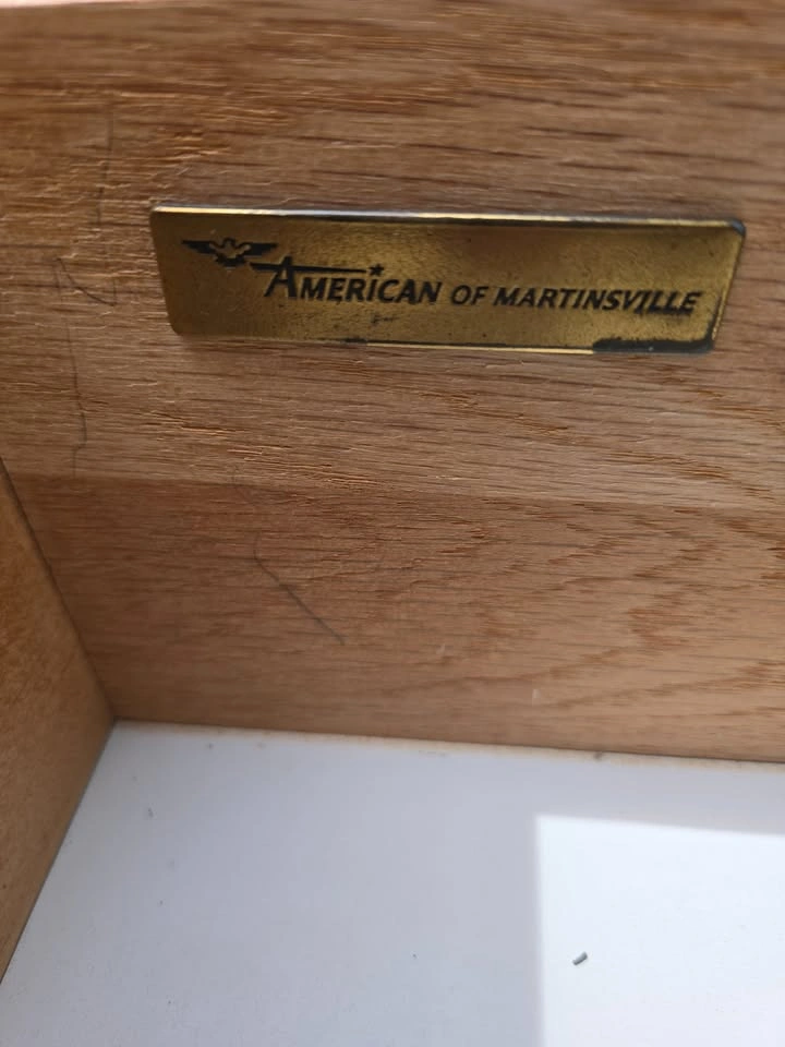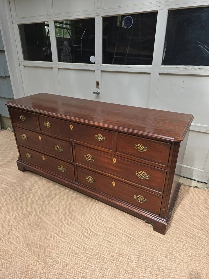 Vintage American of Martinsville dresser. Solid mahogany with brass hardware. Dimensions: Width: 68", Height: 33", Depth: 20" Pick up is in New Fairfield, CT, 06812 All furniture is carefully inspected for mold and lead — safety is our priority. Drawers and hardware are checked to ensure everything functions smoothly. Interiors are cleaned and waxed, so your dresser arrives fresh, smooth, and ready to enjoy. Follow us on Instagram @ed.furniture.design.llc! Payment: Cash, Zelle or Venmo.