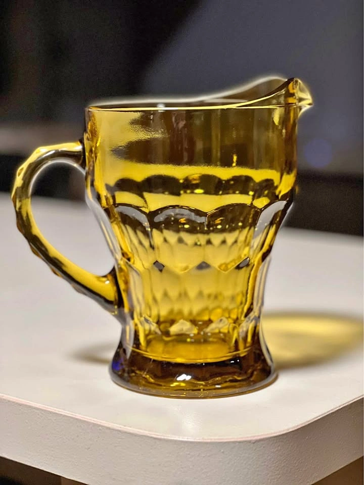 This is a vintage Anchor Hocking Georgian Amber pitcher. The pitcher is made of pressed amber-colored glass with a honeycomb or thumbprint pattern. Decorative handle with paneled design. Spout for pouring. It was first produced in the 1950s. This pitcher is a sturdy and heavy piece of glass.