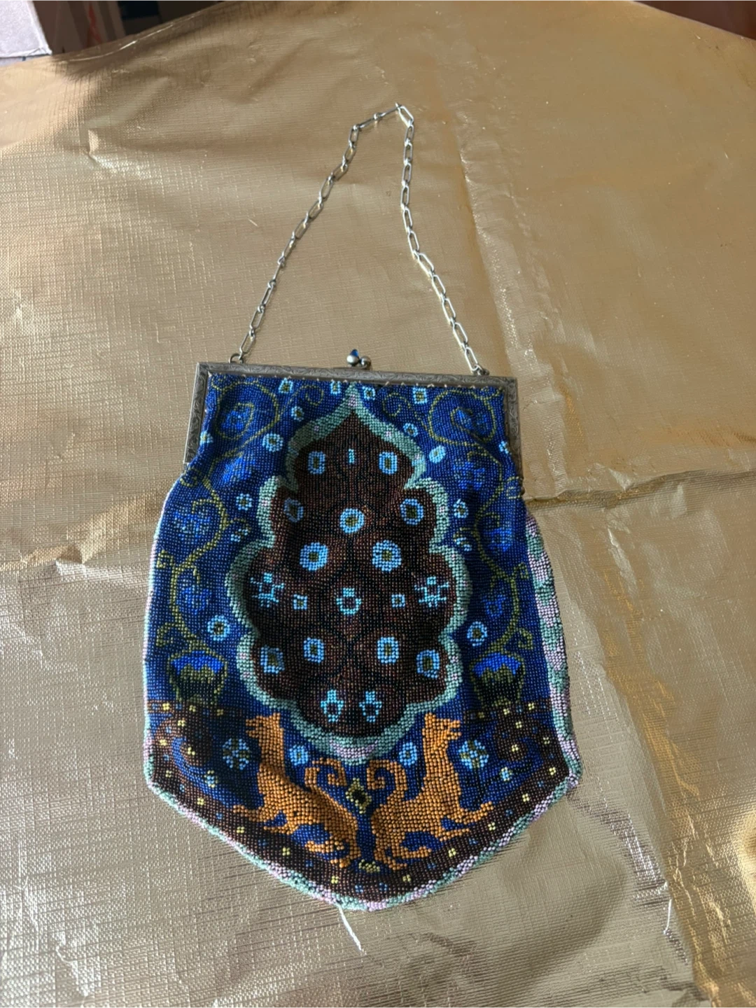 This is a vintage beaded evening bag with a metal frame and chain strap. It features intricate beadwork in blue, brown, and gold tones, with a unique design. It's in good condition for its age and would be a lovely addition to any collection