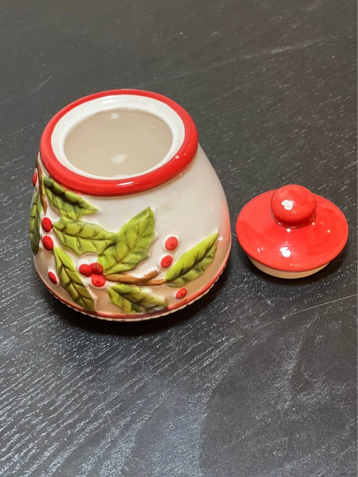 131The set features a classic holiday motif with green holly leaves and red berries, hand-painted on a light-colored (ivory or white) ceramic background. The sugar bowl has a red lid with a red handle, and the creamer features a red handle. Material: Ceramic or stoneware. Features: The sugar bowl includes a lid. Small chips as shown in photos as well as some discoloration.