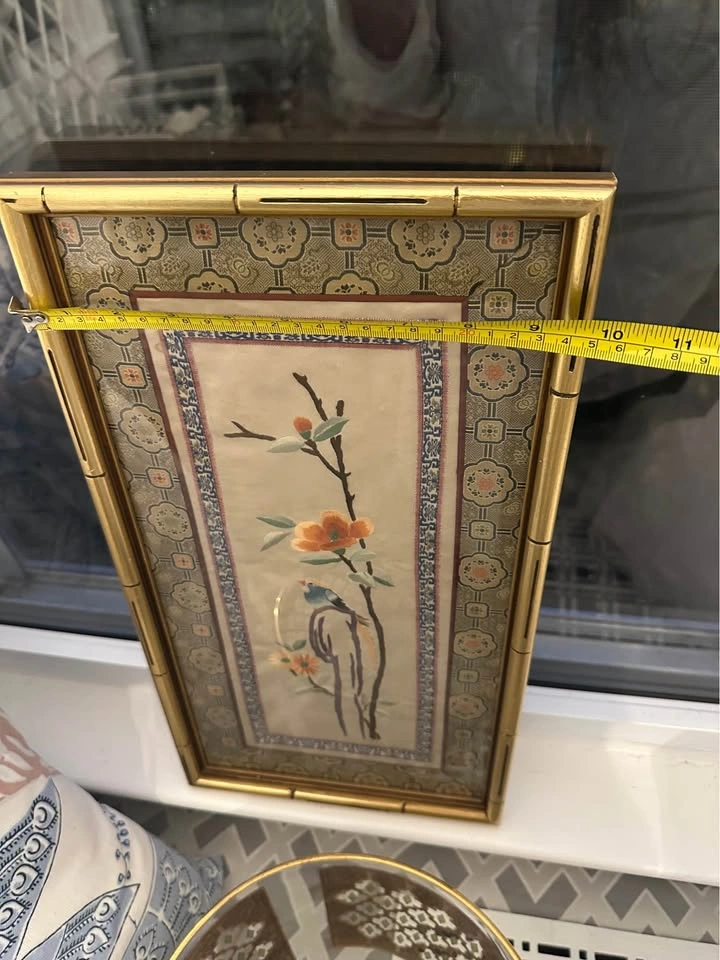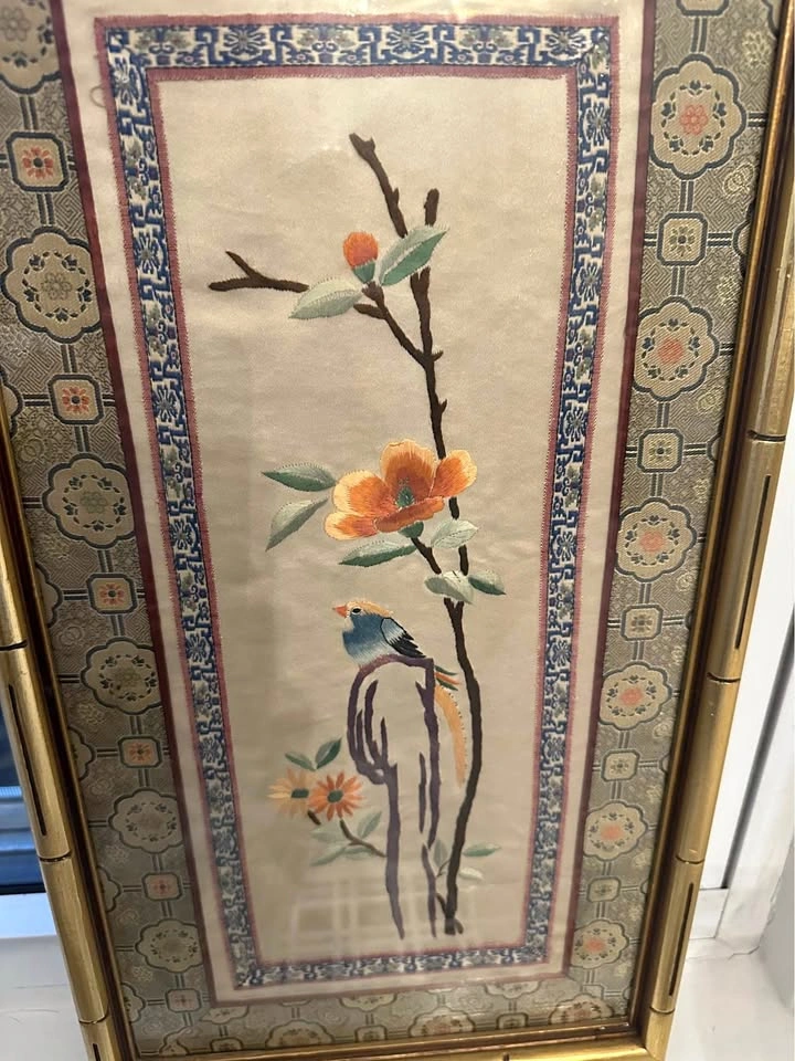 15VINTAGE Chinese Silk Embroidery Framed Art. 9.75x18 silk embroidery panel Frames is faux bamboo Beautiful design of flowers and bird Preowned, in great vintage condition!
