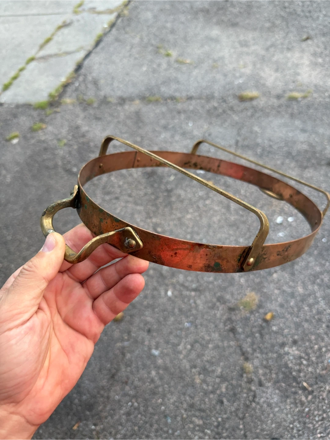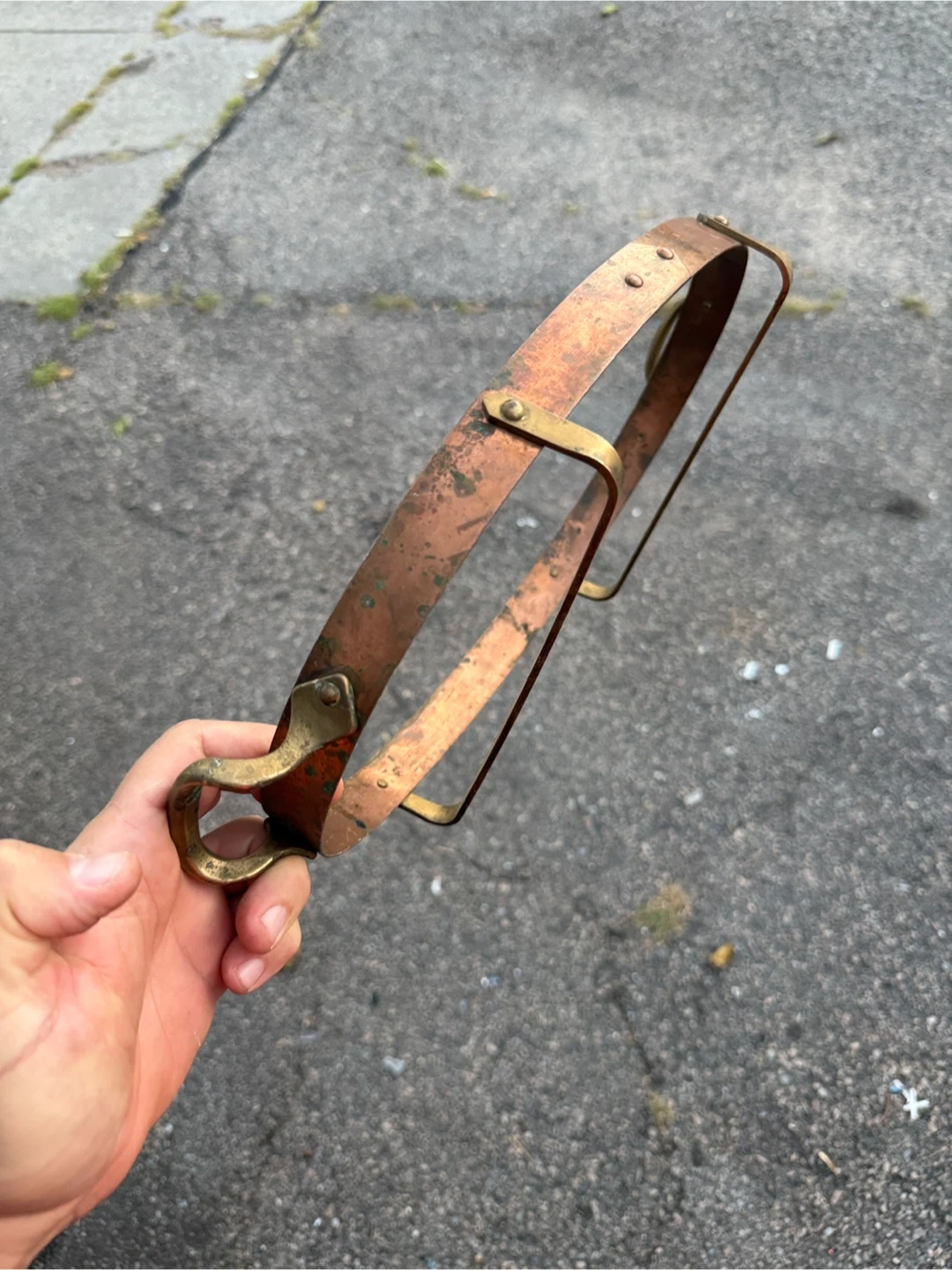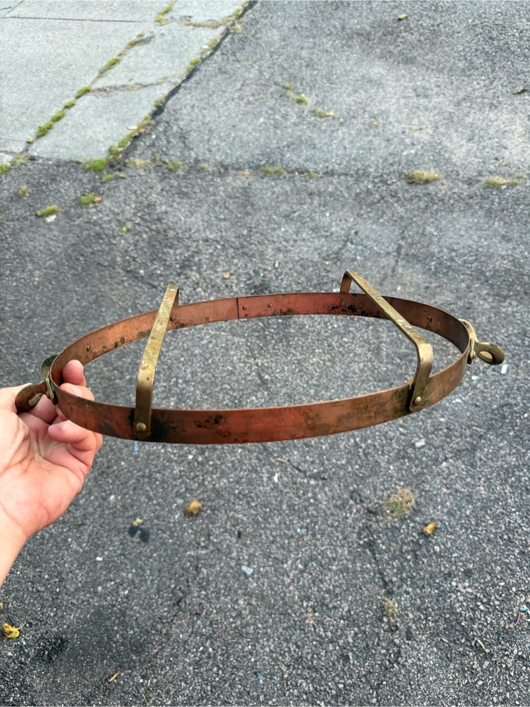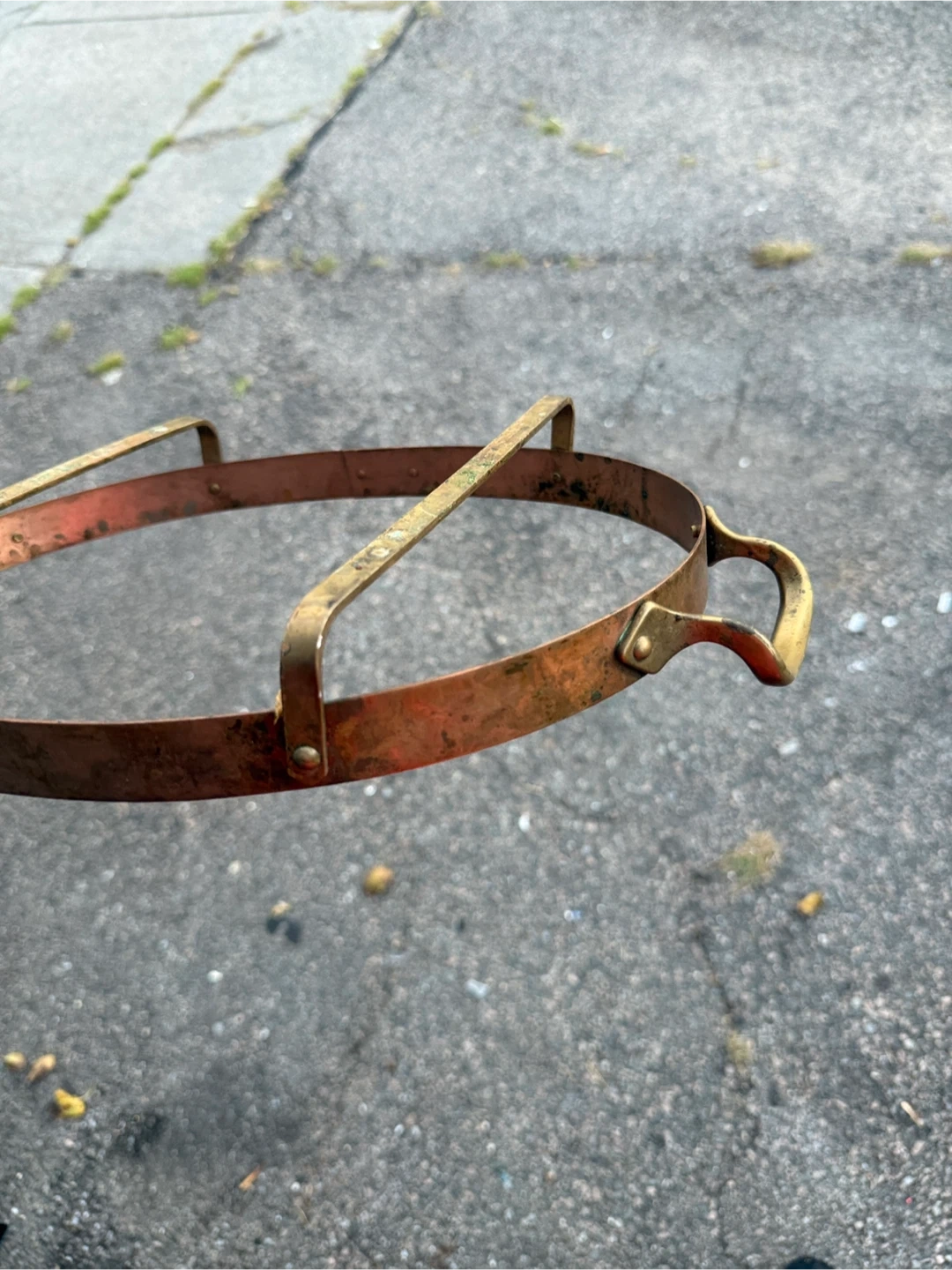 Selling a vintage copper and brass metal strap. It has a unique design and could be used for various purposes. It shows some signs of wear and age, adding to its vintage charm