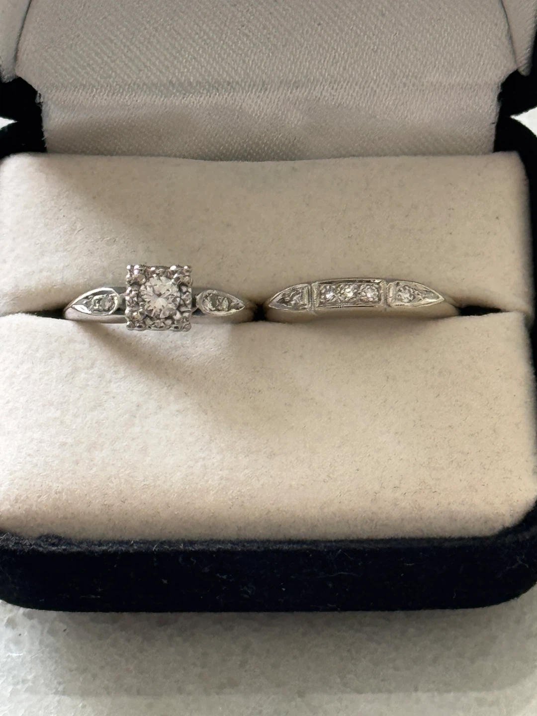 Selling a beautiful vintage diamond wedding ring set. The ring size is approximately 6. It comes in a box. 14 K White gold.