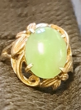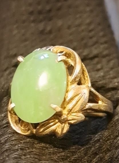 Selling a vintage ring featuring a beautiful green jadeite The ring has a floral design. It's in great condition!