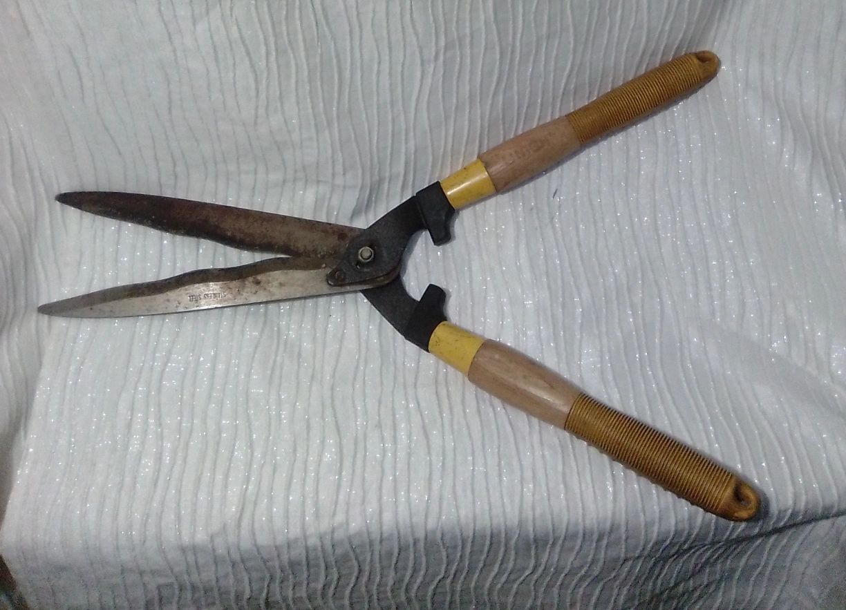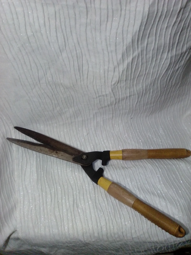 Heavy-duty shears. Long wooden handles. Great for trimming hedges or grass.
