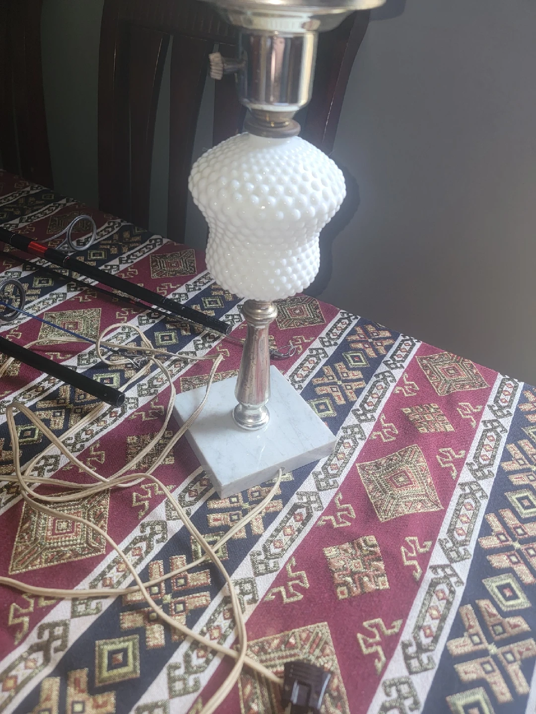 67Selling a vintage hobnail milk glass table lamp. It features a white hobnail glass shade and a marble base. It is in good condition and would be a charming addition to any room!