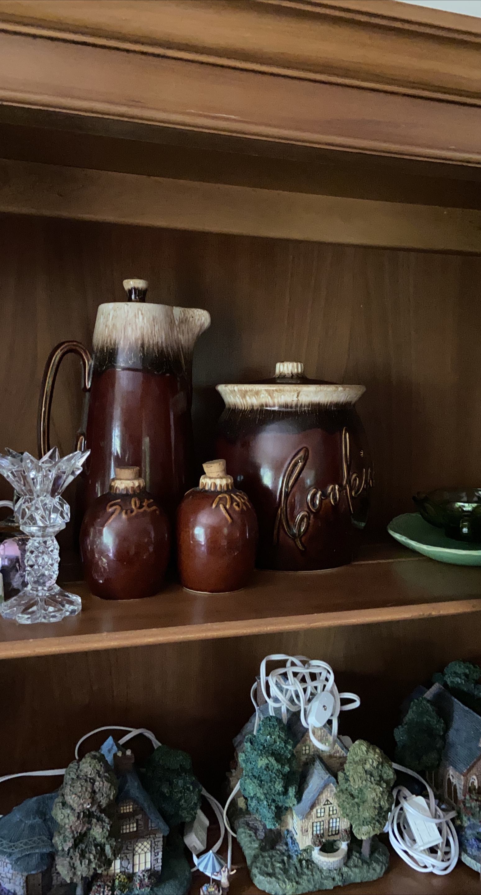Selling a vintage Hull pottery kitchen set. Includes a pitcher, cookie jar, and salt and pepper shakers. All pieces are in good condition and would make a great addition to any kitchen!