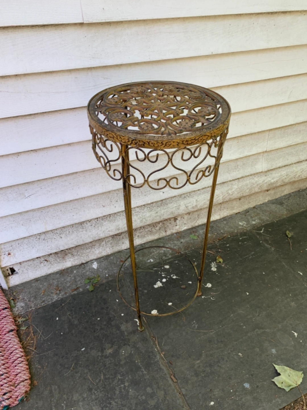 Selling a vintage metal plant stand. It has a beautiful ornate design and is perfect for displaying your favorite plants. It's in good condition and ready to add a touch of vintage charm to your home!