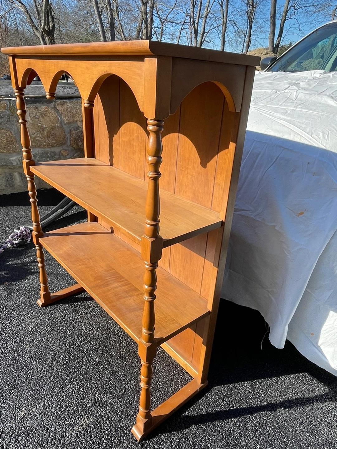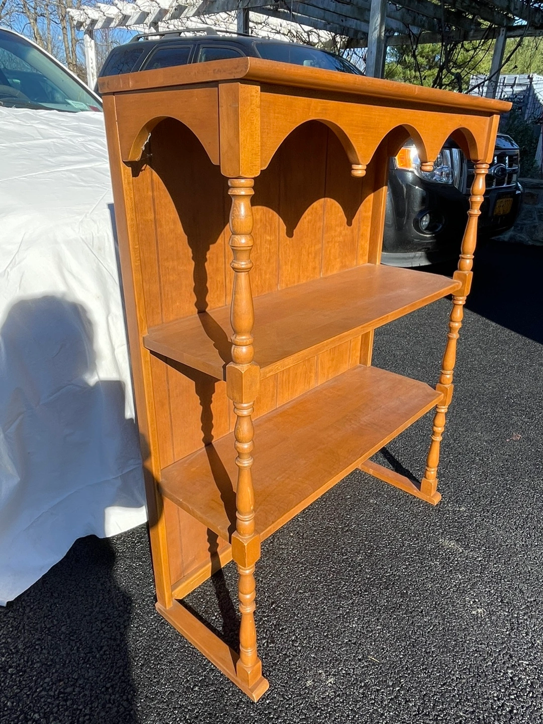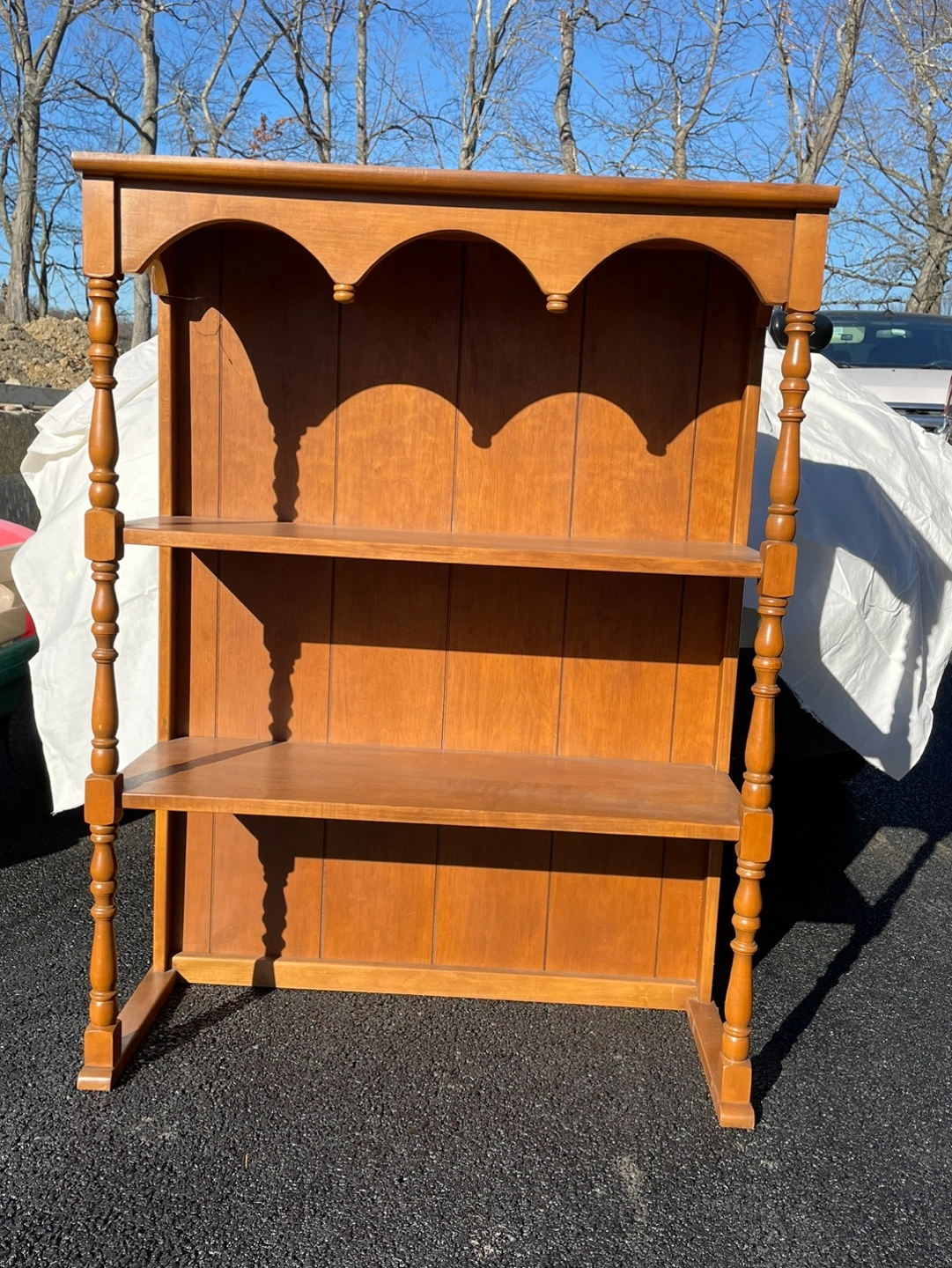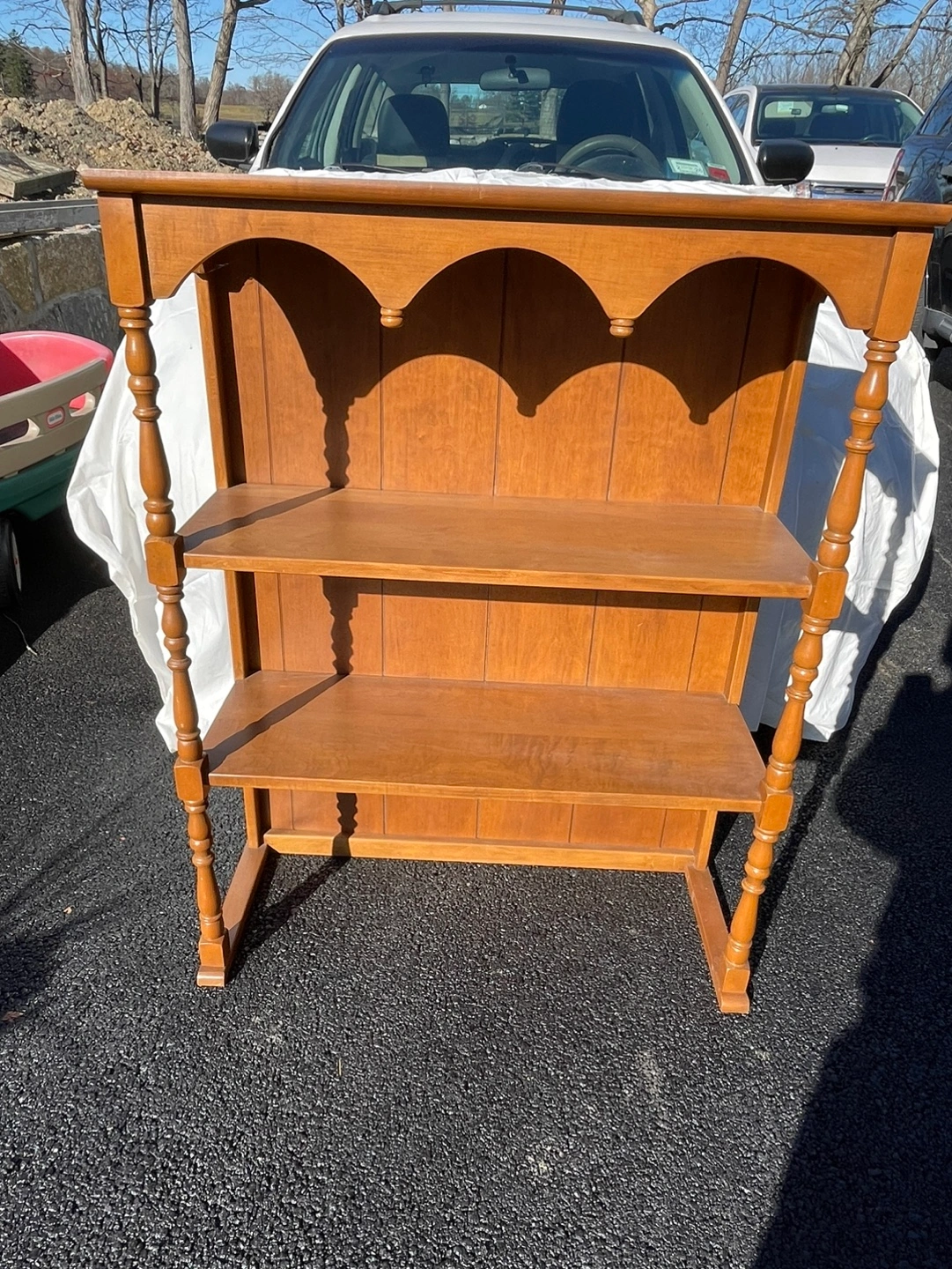 Mid Century wood Book shelf with three shelves Has turned posts and a solid wood base. Good condition. Freestanding or can sit on desk or cabinet. Easy to move. 30 1/2” x 40” x 10 1/2”. Pickup/Cash only. $50