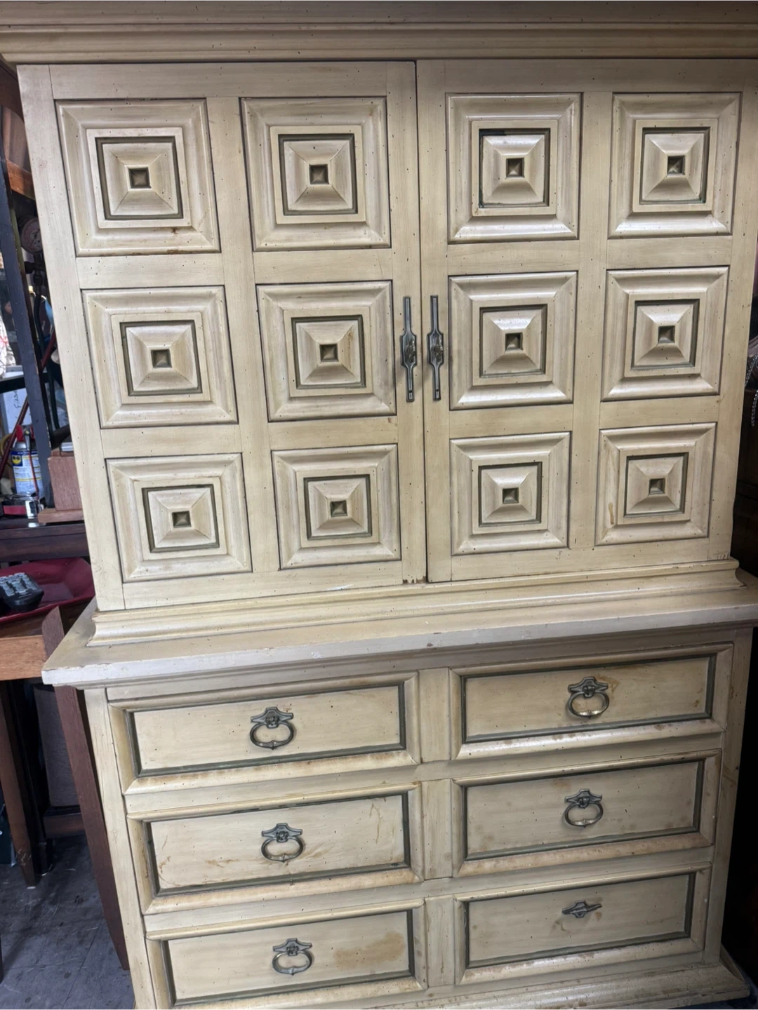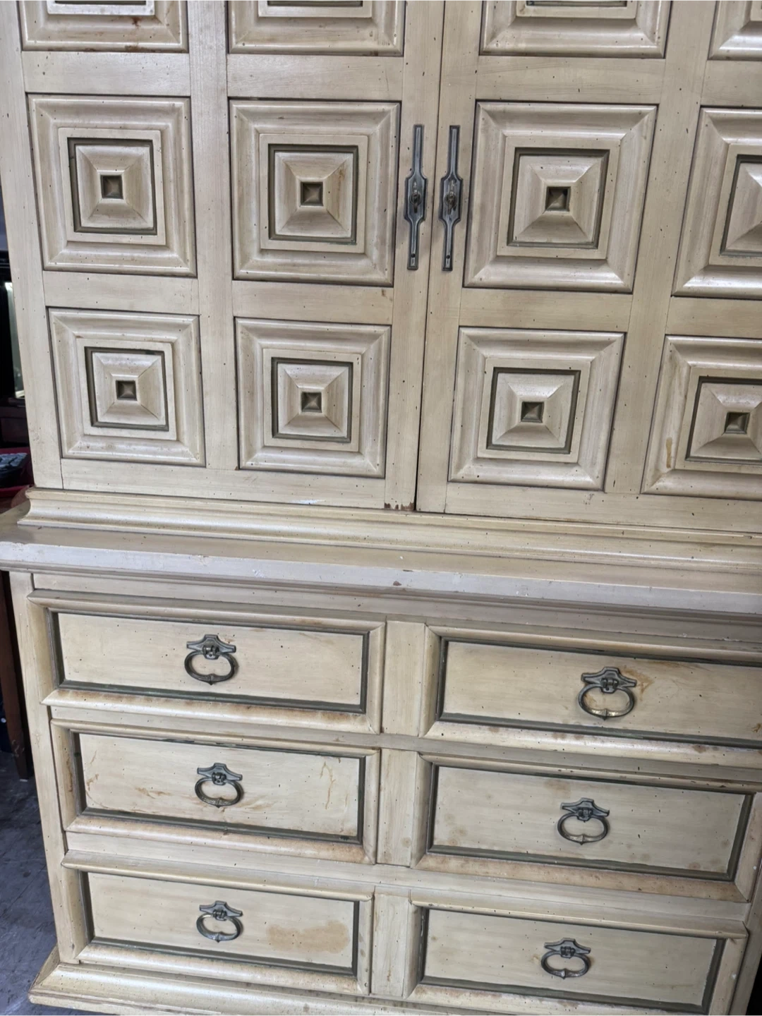 60Selling a vintage armoire with a unique design! It features multiple drawers and cabinet space, perfect for storage. The off-white color gives it a classic look. It is a full set with a top and bottom piece.