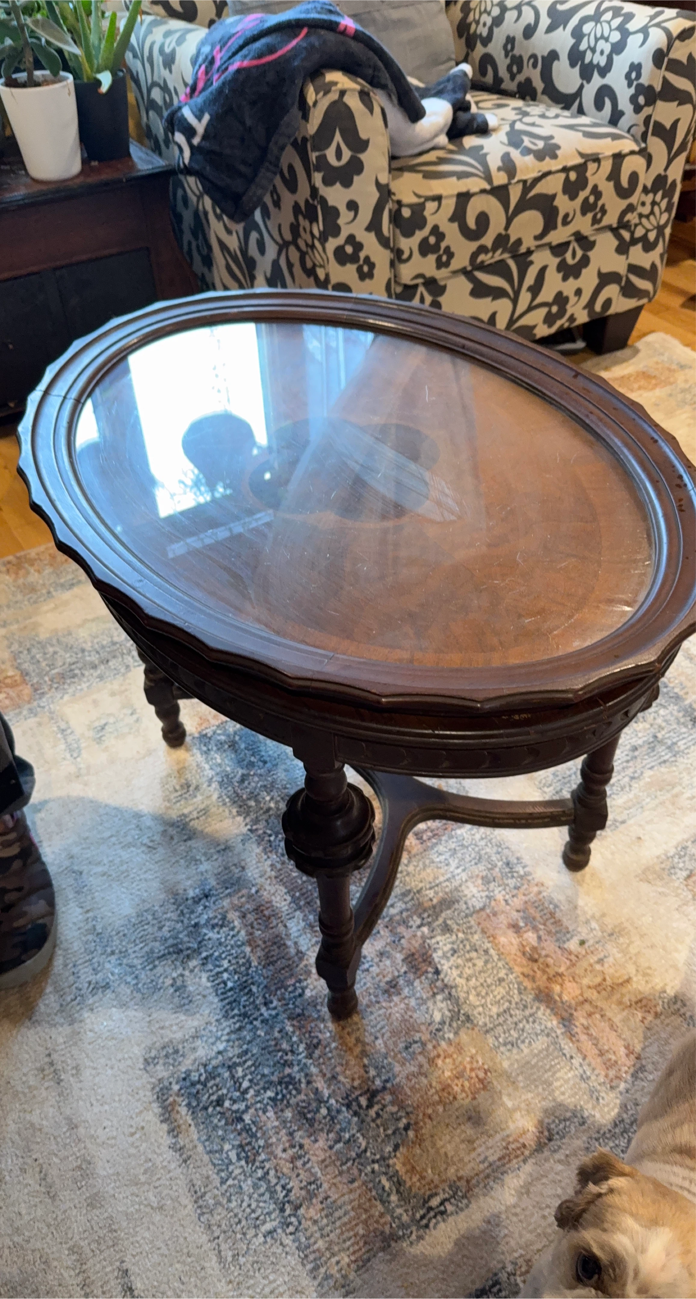 Selling a vintage oval coffee table with a glass top. It has a dark wood finish and decorative legs. The table shows some signs of wear, but is still sturdy and functional. It would be a great addition to any living room!