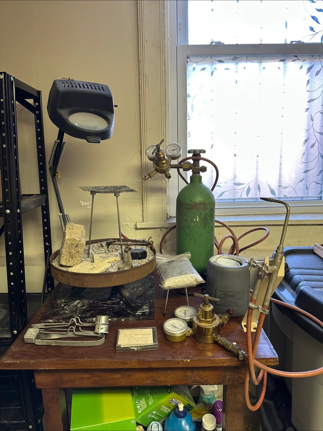 Vintage Oxygen and Propane torch and accessories. Includes jewelers welding torch fixtures (tanks not included), soldering stand with gravel, 3 torch strikers, double clip scolding stand, jewel torch adapters, bag of garnet sand, welding stones, magnifier light and electric pickler.