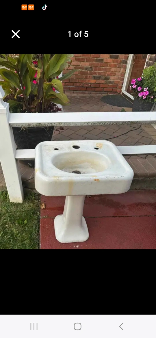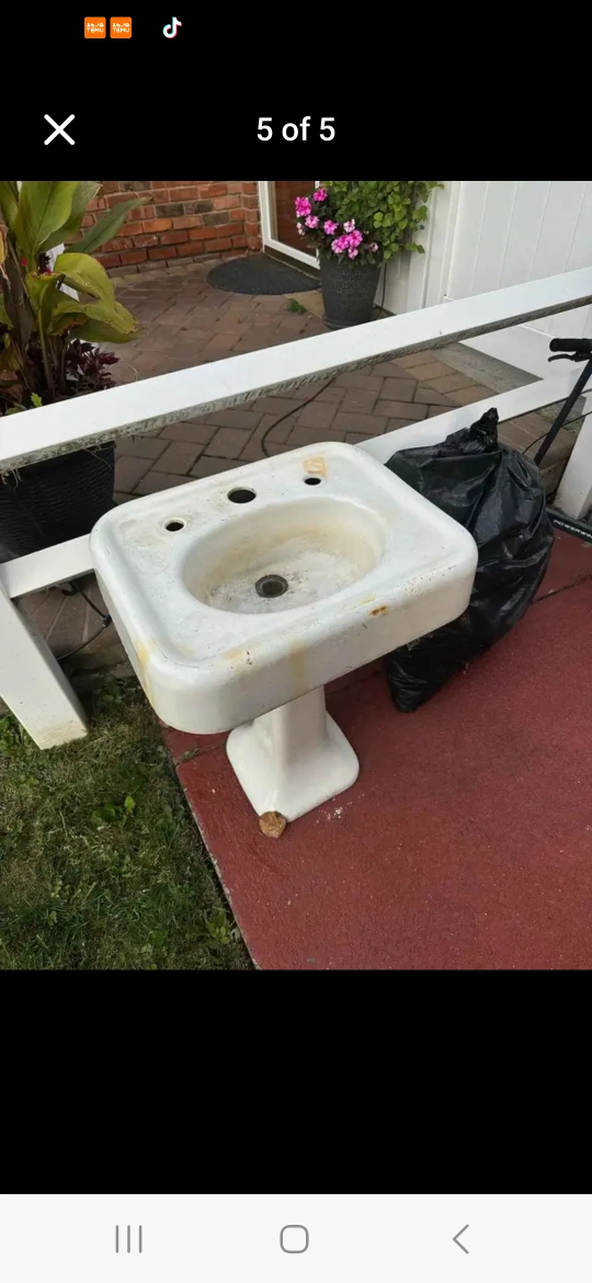 21Vintage Cast Iron pedestal sink with three holes (no hardware). The sink and pedestal are in good condition with some minor discoloration. Sink and pedestal separate. Great restoration project.