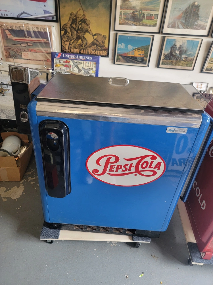 60Selling a vintage Pepsi-Cola cooler! It's a unique piece with a classic design. The cooler has a blue exterior and the iconic Pepsi-Cola logo on the front. Great for adding a retro touch to any space!