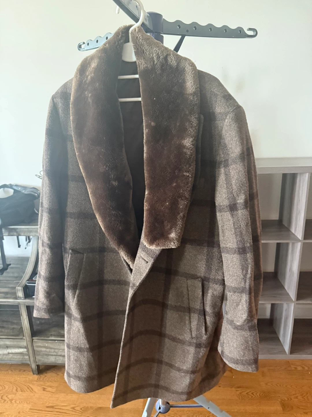 Selling a vintage plaid coat with a faux fur collar. It's in great condition and ready for a new home! The coat features a classic plaid pattern in brown tones and a plush faux fur collar for added warmth and style