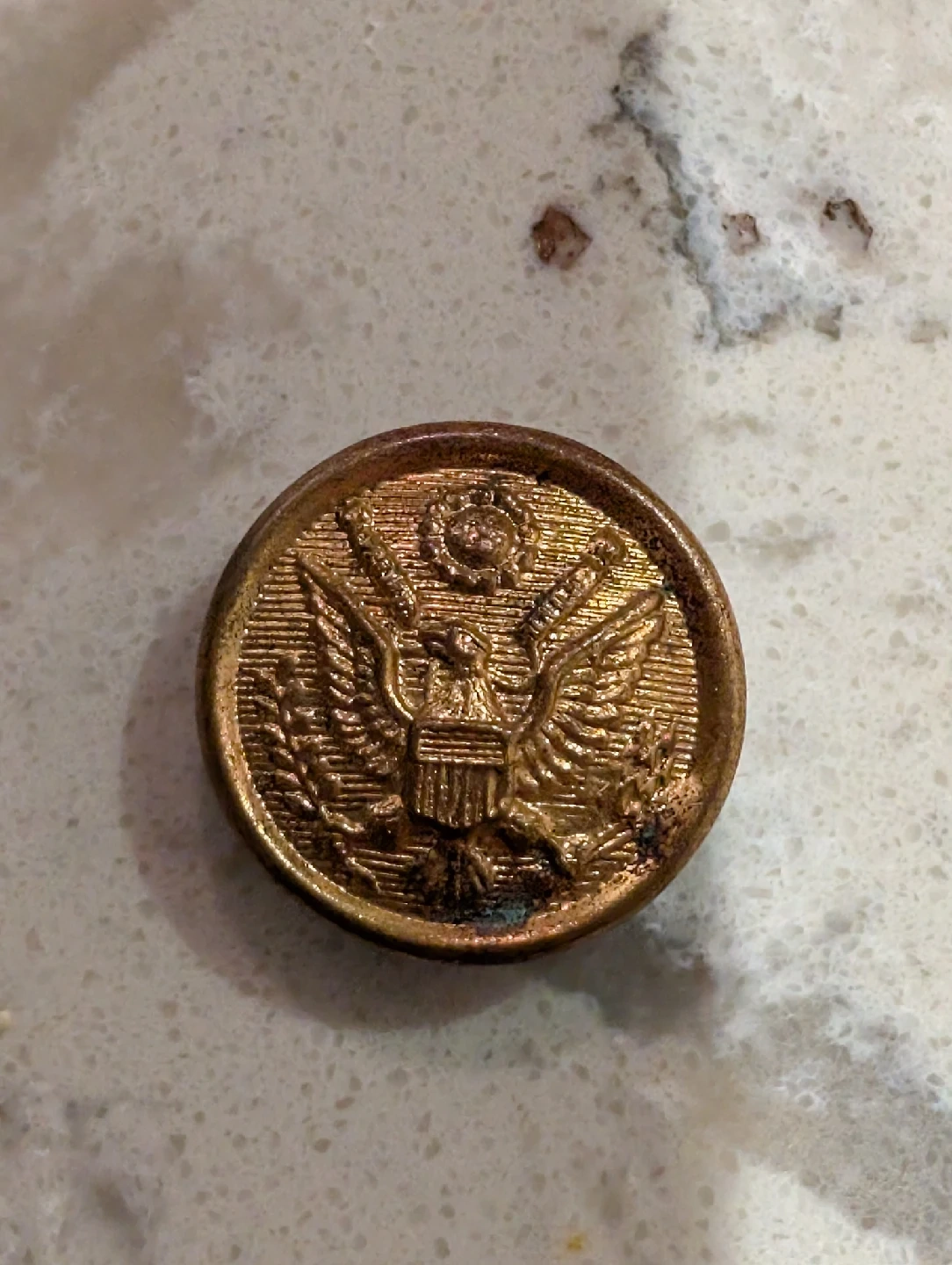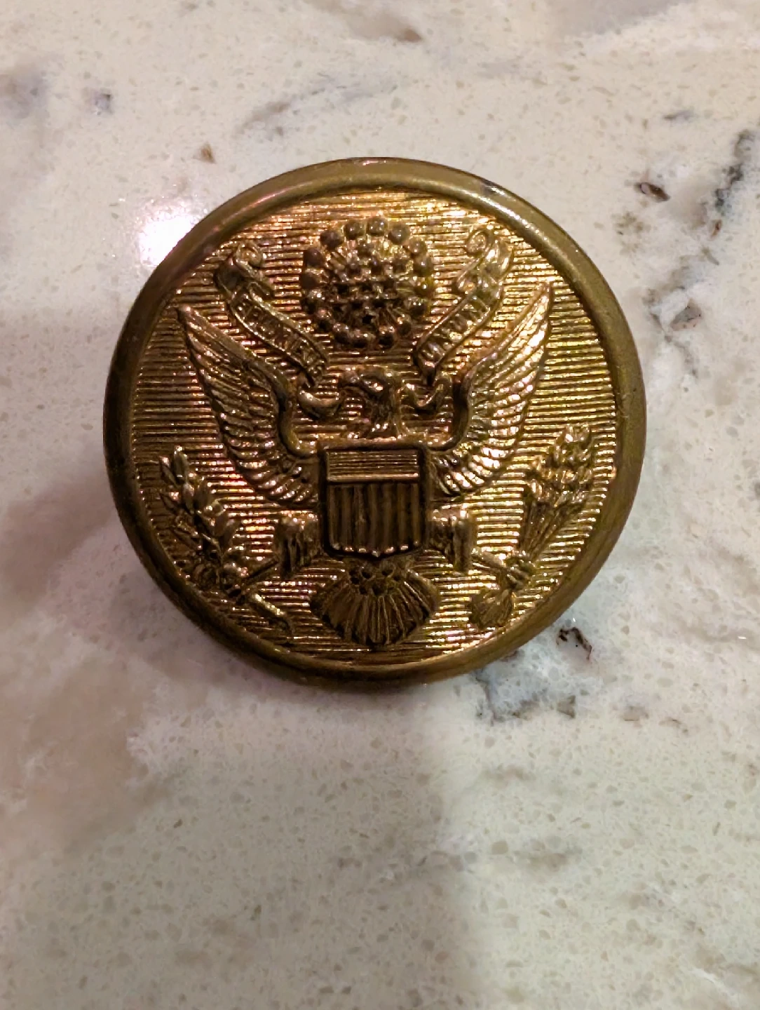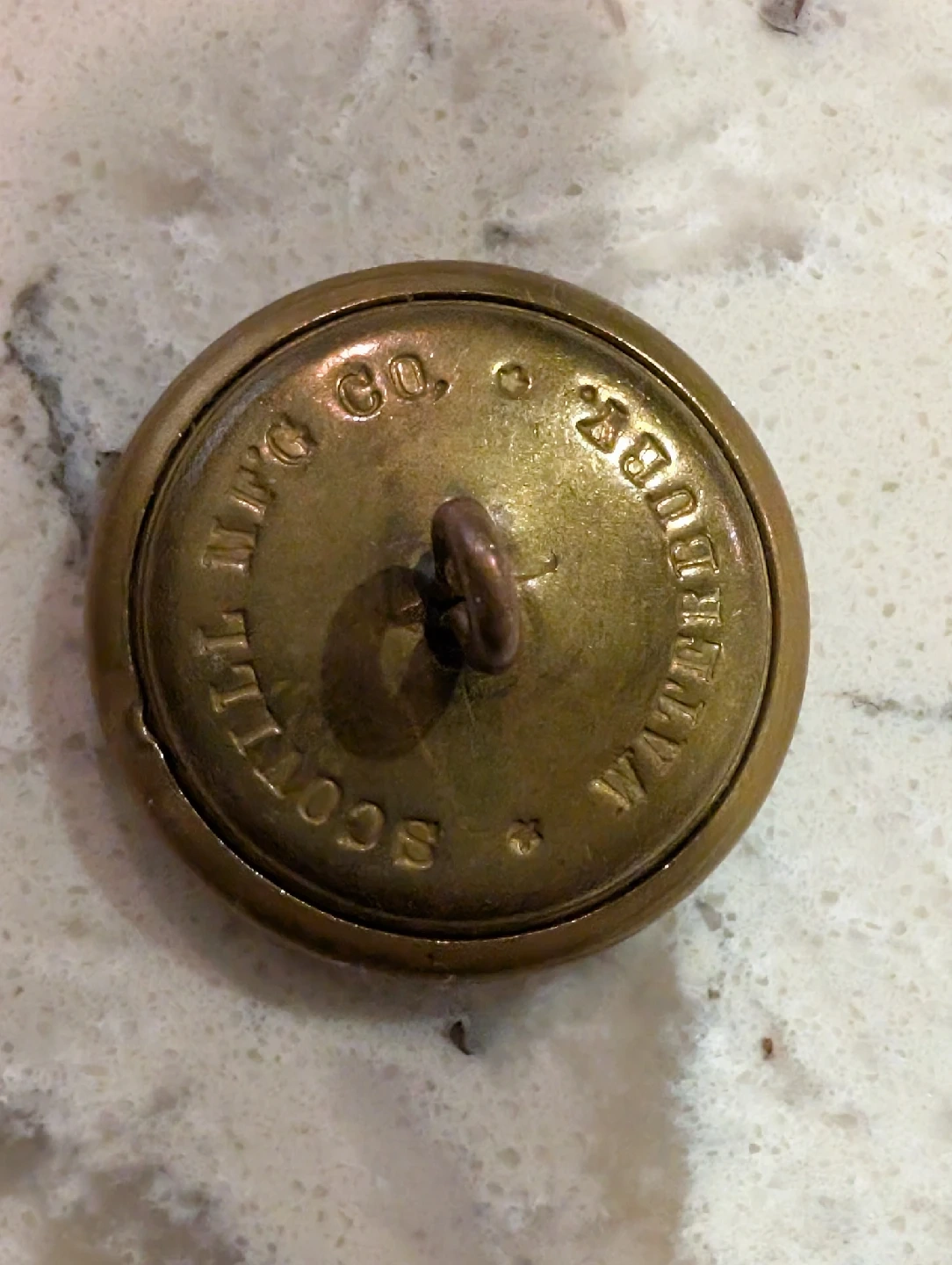 326Selling a vintage uniform button made by SCOVILL MFG CO. It features an eagle design on the front. The back is marked with the company name and location, Waterbury. Two buttons size 1" and 3/8".