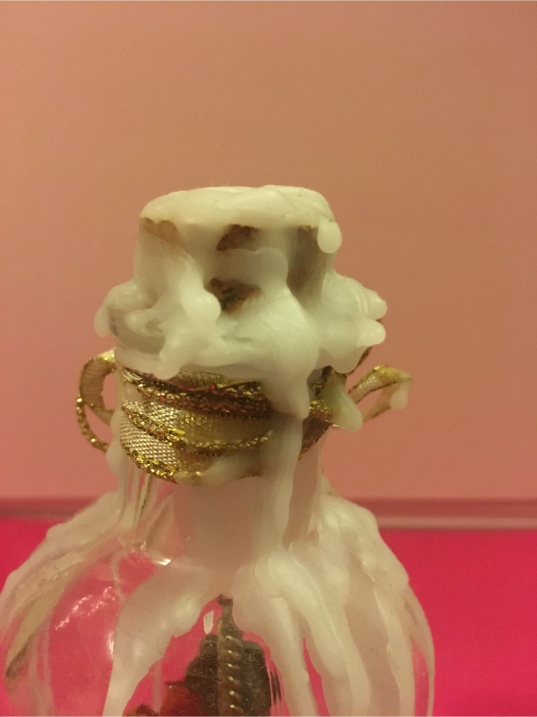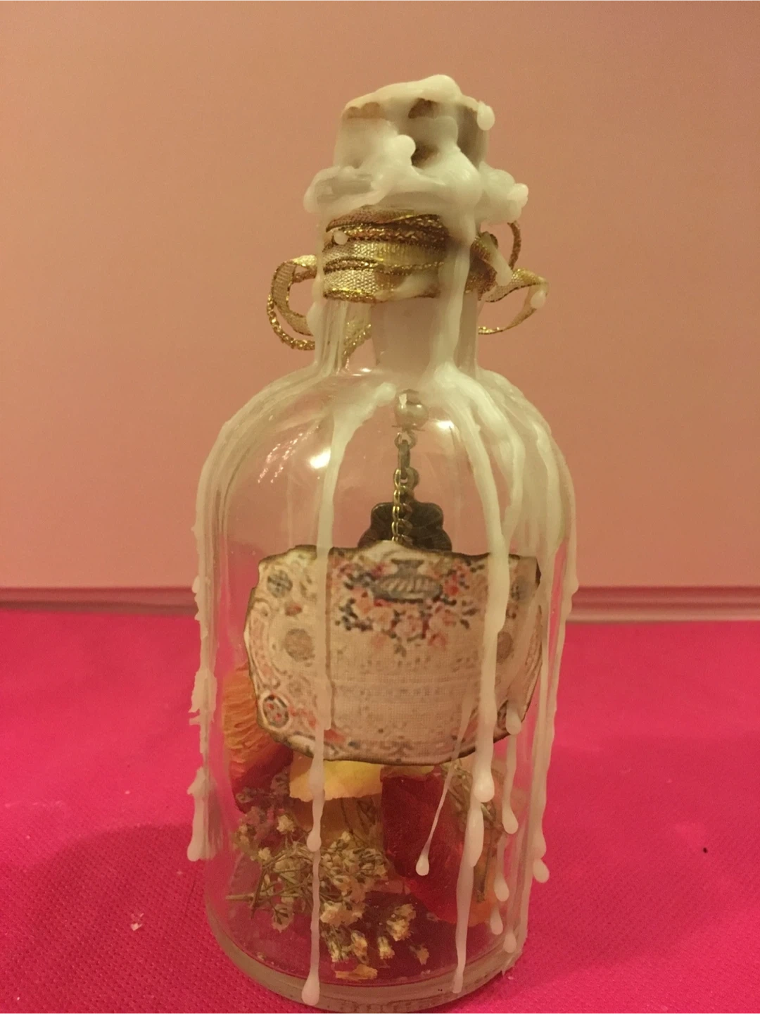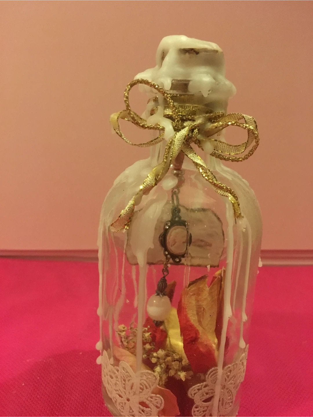 71This is a unique decorative bottle with a vintage style. It's filled with dried flowers, a cameo pendant, and sealed with wax. It would make a lovely addition to any room!