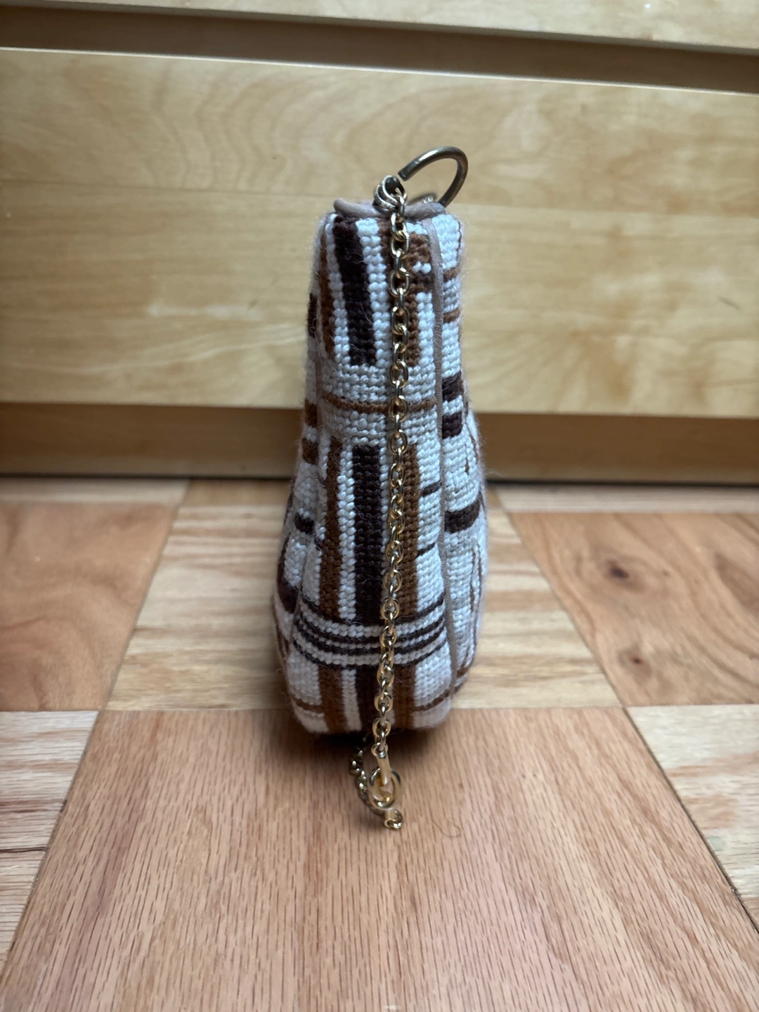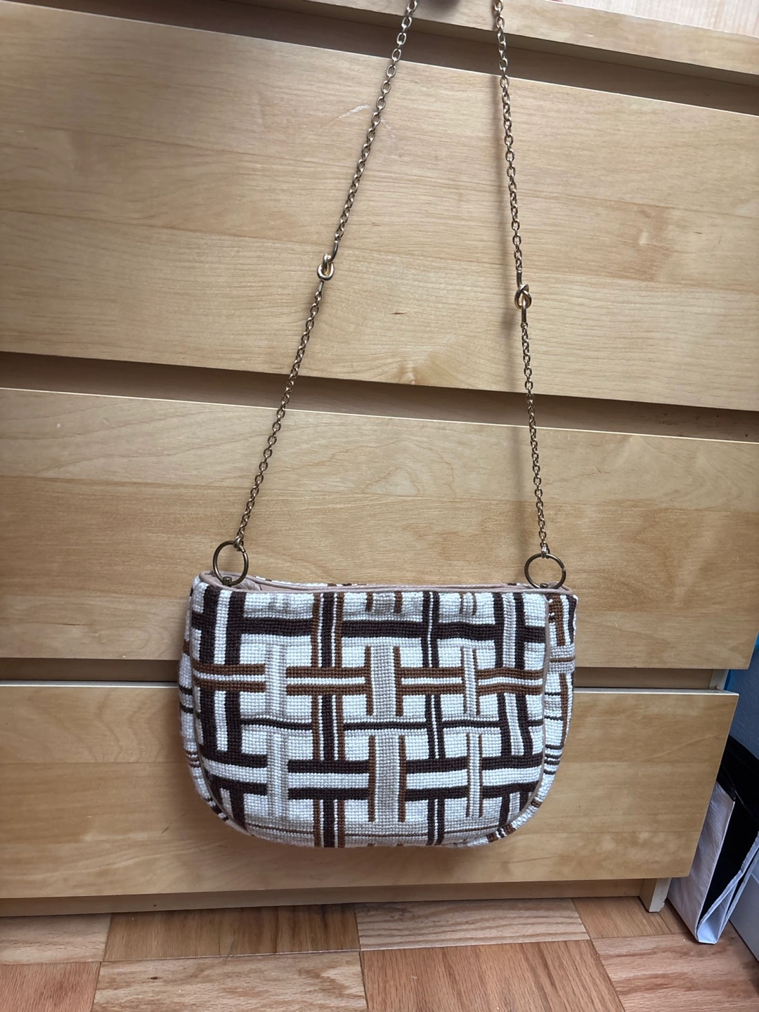 Selling a shoulder bag with a unique vintage-inspired pattern! It features a gold-tone chain strap and a neutral color palette of brown, white, and beige. The interior is lined with a soft, light brown fabric. Perfect for adding a touch of retro charm to any outfit