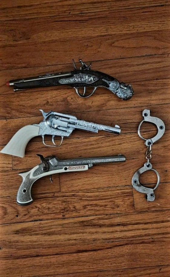23Collectible used toy guns and handcuffs. Three toy pistols, one revolver. Intricate detailing. Metal and plastic construction. Great for collectors.