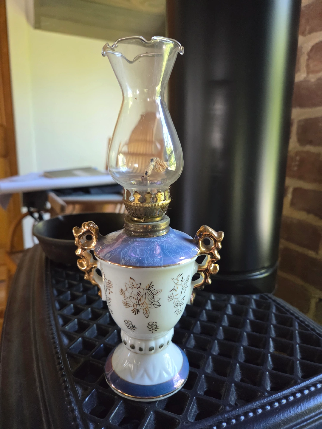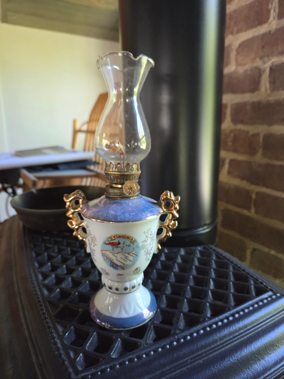 65This is a charming vintage miniature oil lamp, perfect as a decorative piece or a unique addition to a collection. It features a clear glass chimney and a porcelain base with a design showcasing Virginia landmarks. The lamp has gold-tone accents and handles, adding to its vintage appeal
