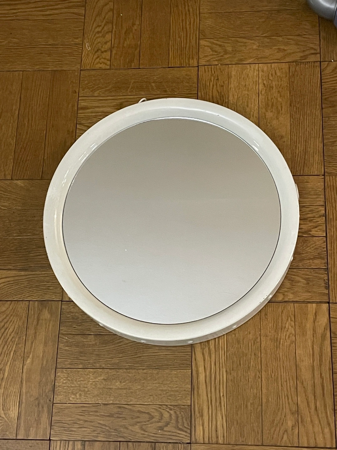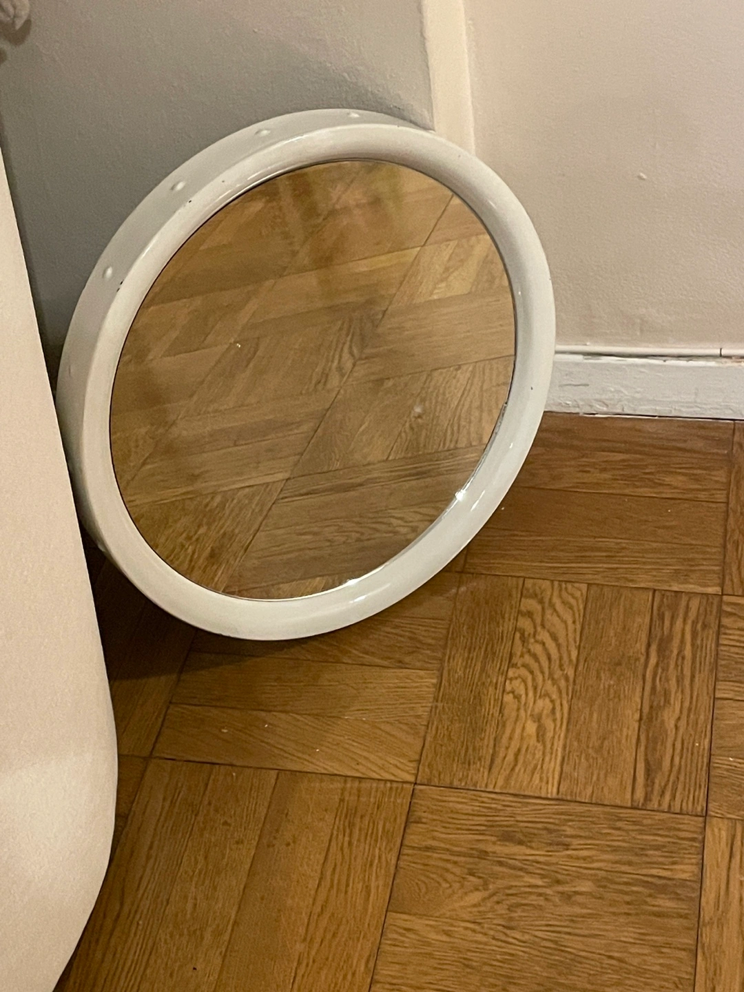 Round mirror, white frame. Small studs around the edge. Great for bathroom or bedroom.