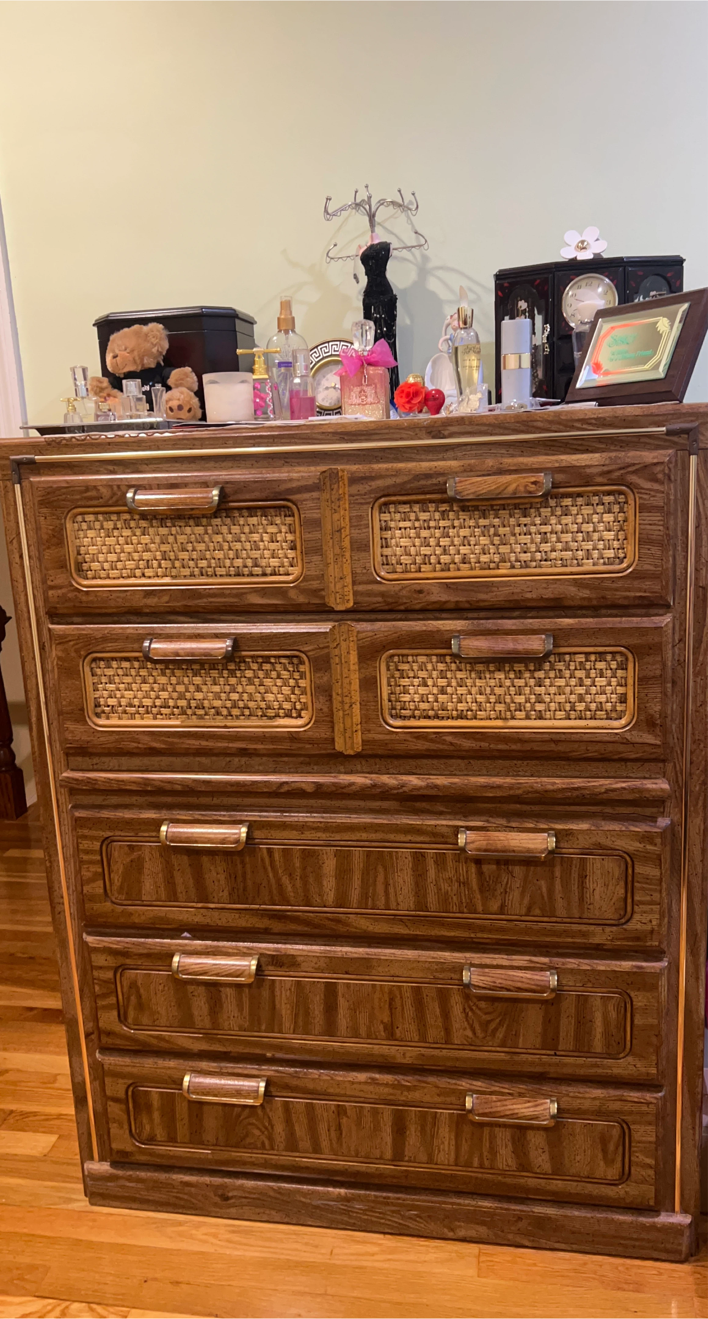 Here's a lovely vintage wood dresser that would add a touch of character to any room! It features a warm wood tone and unique woven detailing on the top drawers. The dresser has multiple drawers for ample storage space. It's in good condition and ready for a new home!
