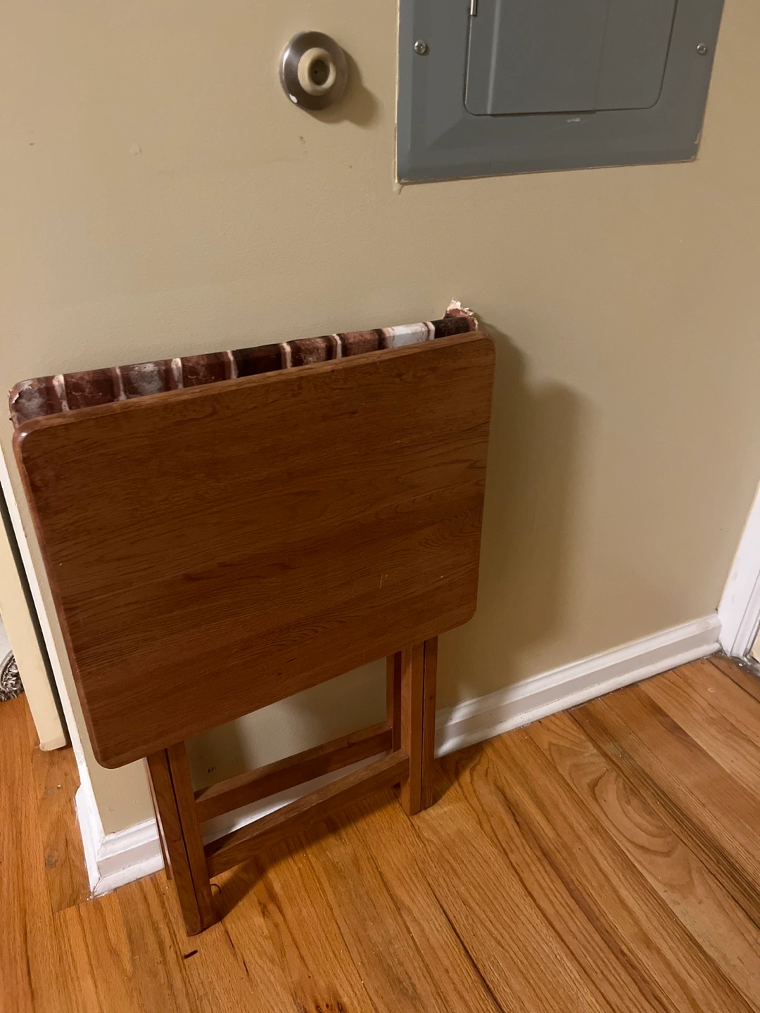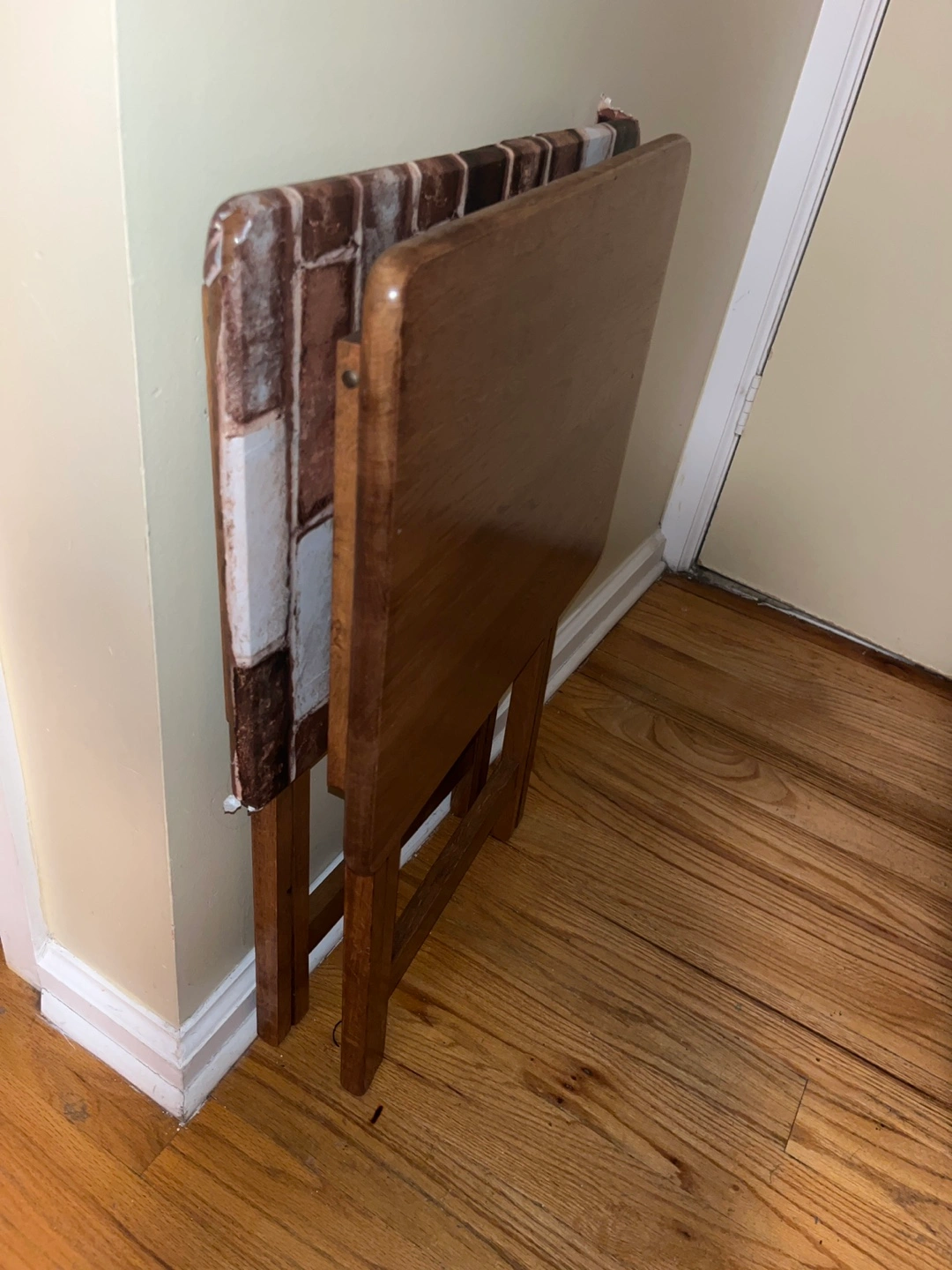 133Selling a vintage wood TV tray table. It's a great little side table that folds up easily for storage. Total of (4) foldable tables The top has a brick pattern design that is from a peel and stick paper that can be removable. Perfect for snacks, drinks, or working on your laptop!