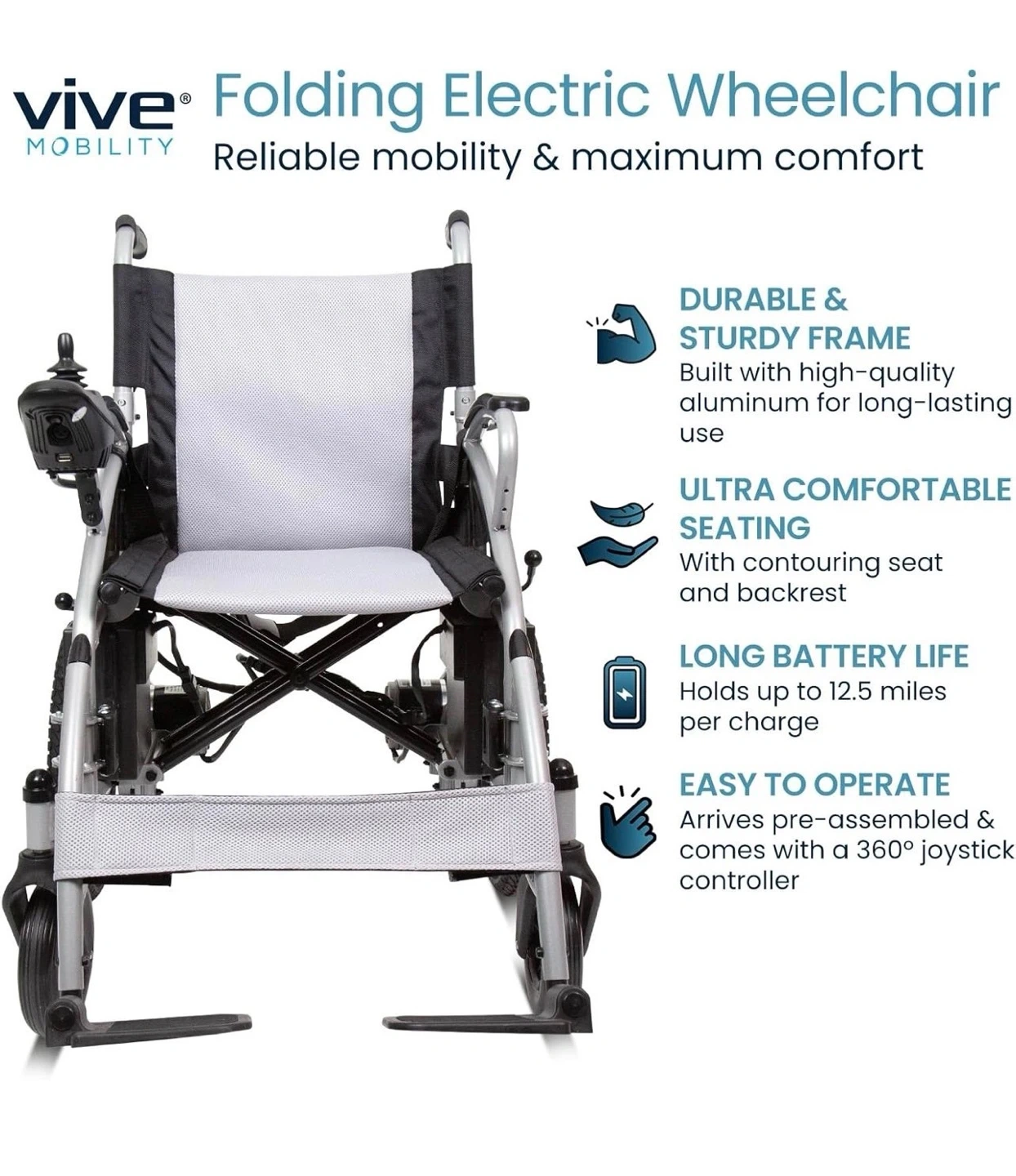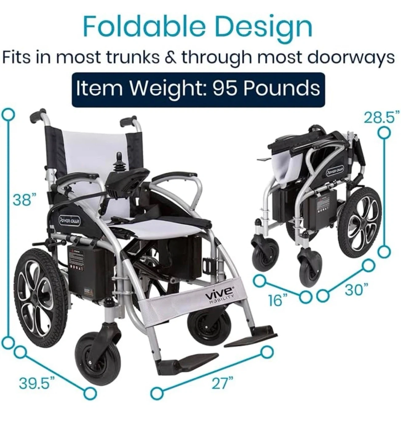 Selling a Vive Mobility folding electric wheelchair! It features a durable and sturdy aluminum frame that supports up to 220 pounds. It has an all-terrain design with durable 16" rear wheels, a height-adjustable armrest, and a thick padded seat. It's also foldable, fitting in most trunks and through most doorways. Item weight: 95 Pounds