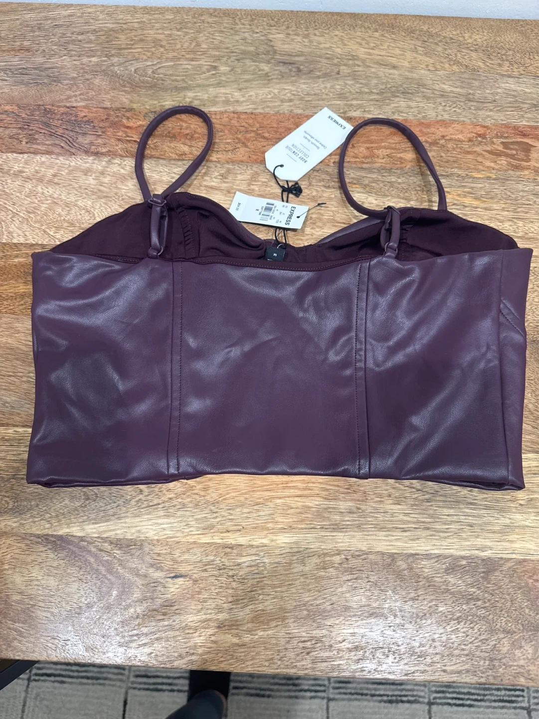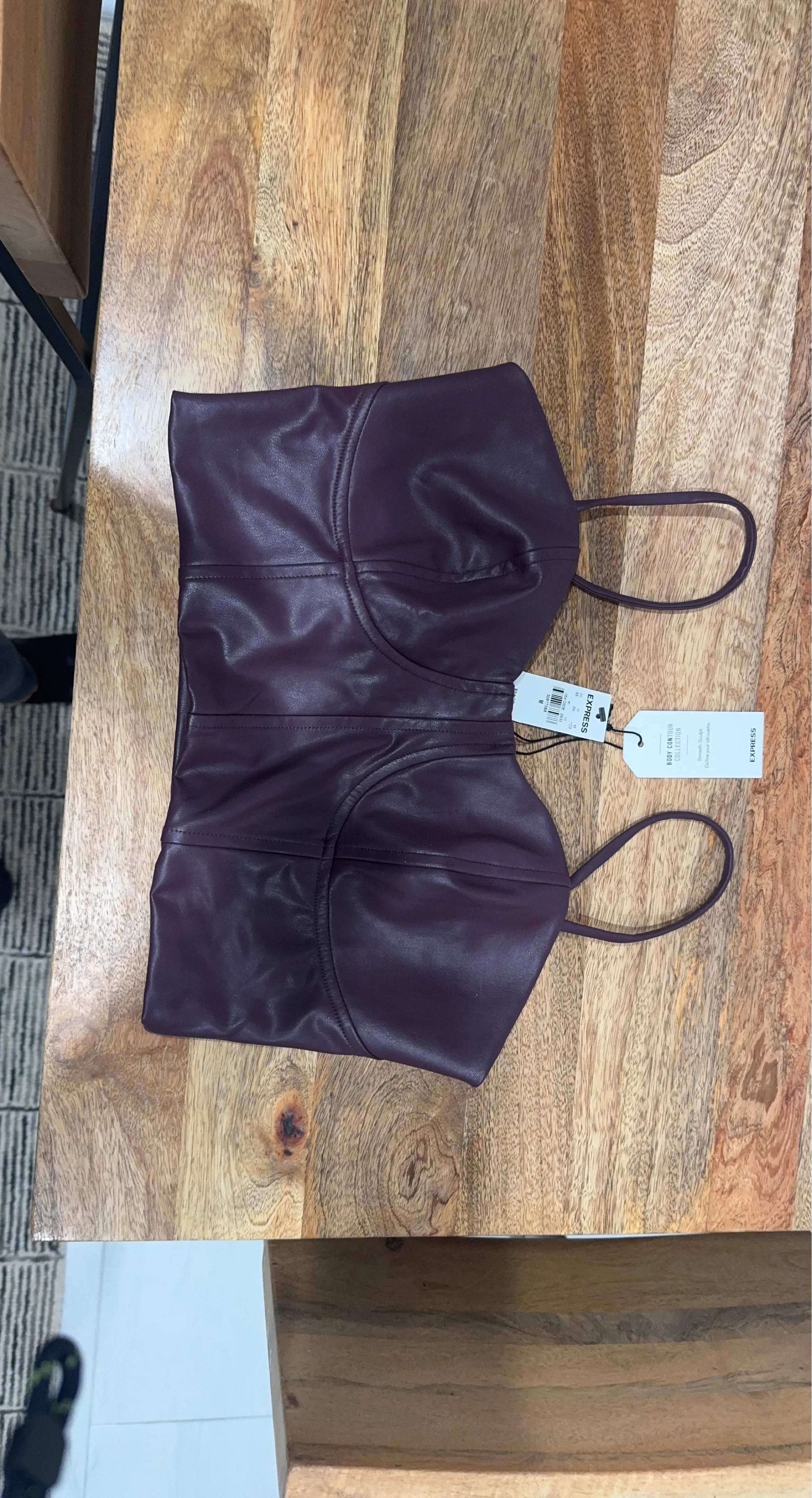 This is an Express Body Contour Collection corset top in plum. It's a size medium and made of a faux leather material. The top is designed to smooth and sculpt your silhouette. It's perfect for a night out or to dress up an outfit!