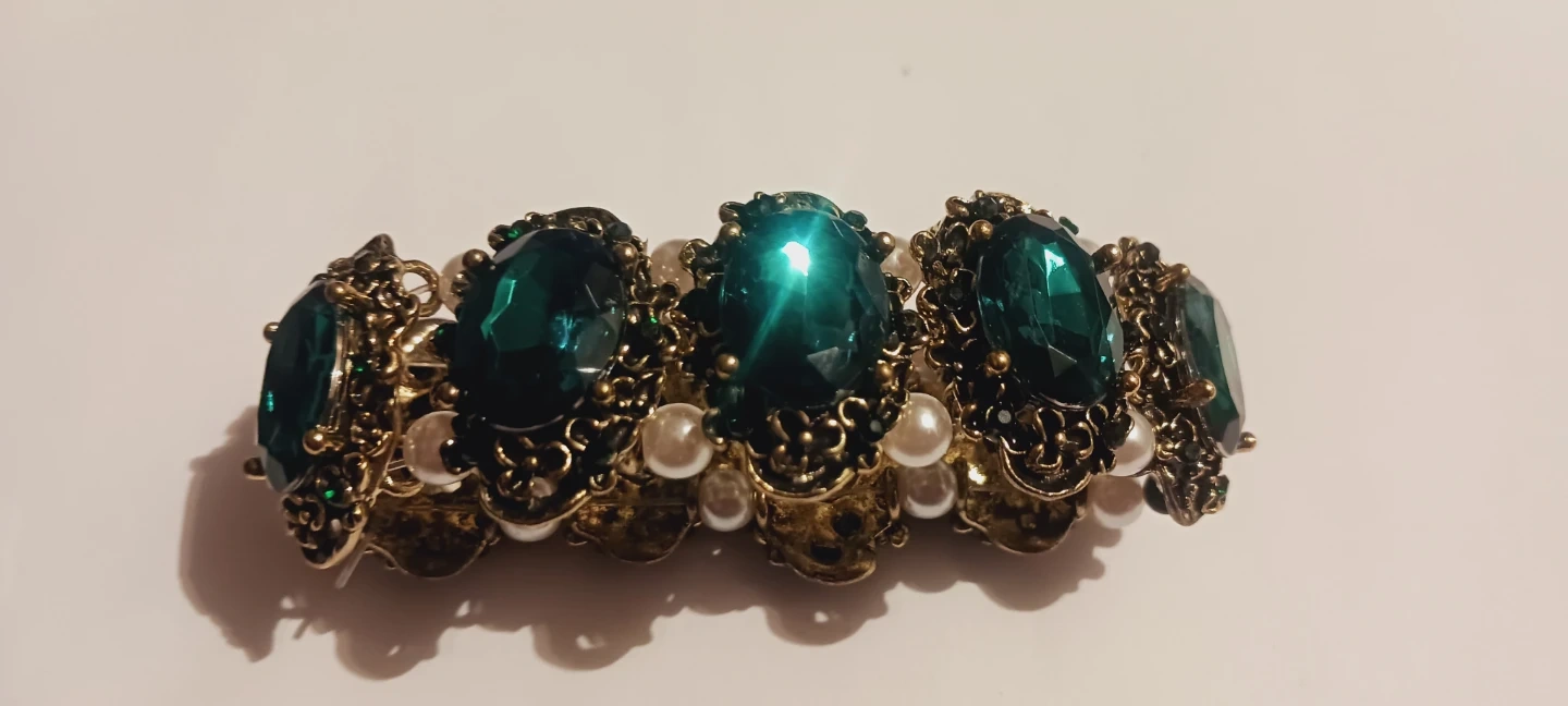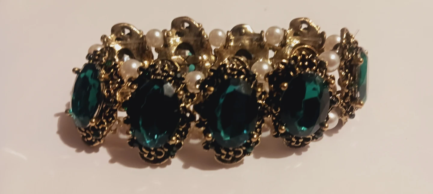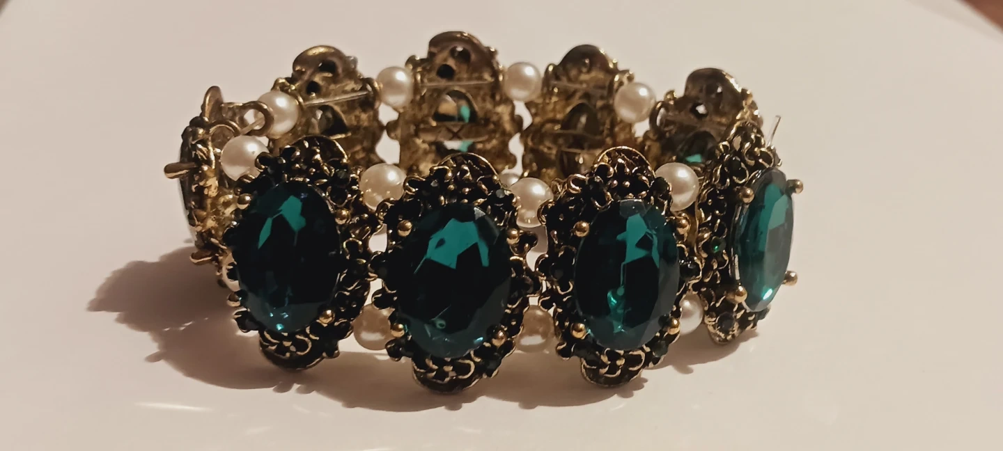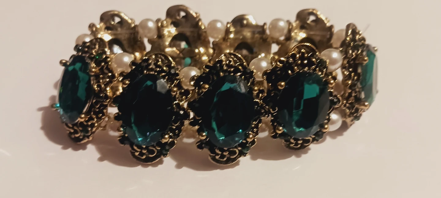 New !!This stretch bracelet features ornate gold-tone metalwork with large, faceted emerald-green gemstones and small faux pearls. It's an elasticated band design for easy wear. The ornate detailing adds a touch of vintage glamour to any outfit!