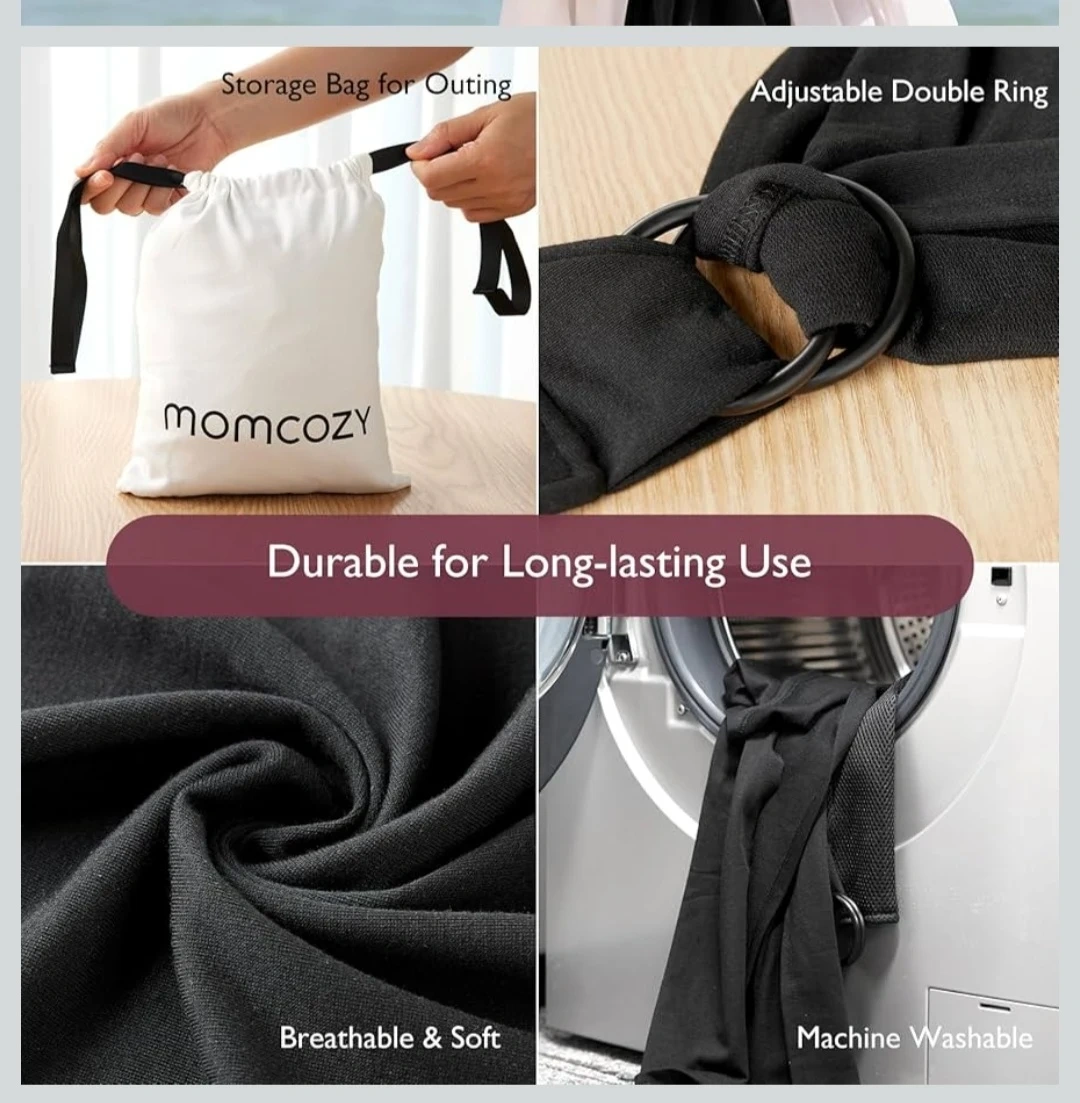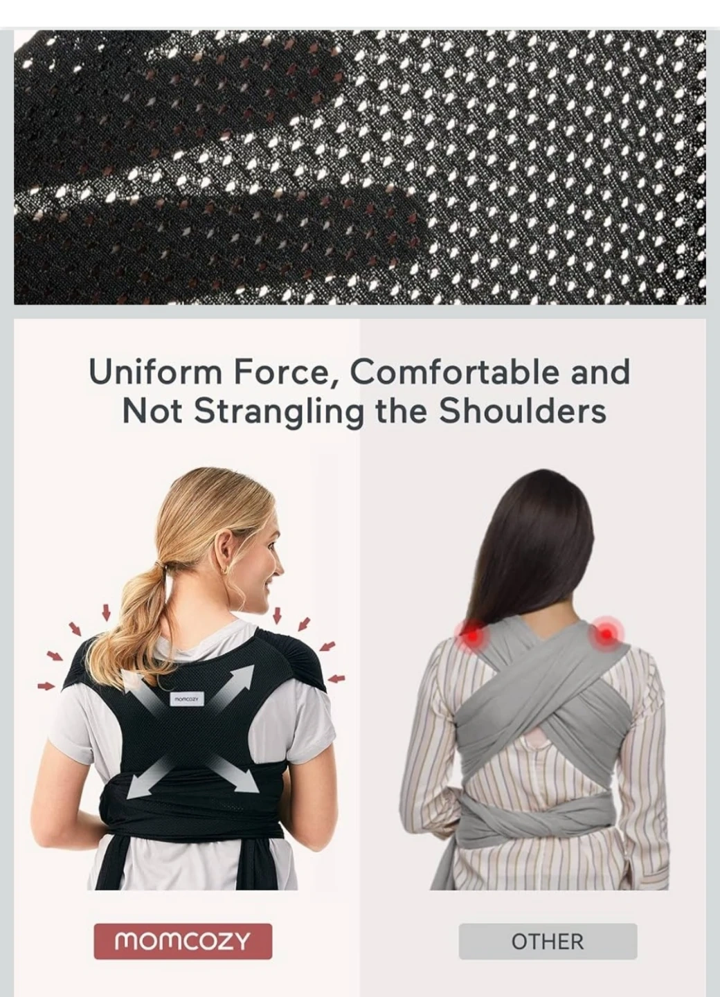 Momcozy baby wrap carrier is designed with adjustable size, the size can be covered to XXS-XXL to suit different groups of people; The baby wrap allows you not to worry about postpartum body changes and other issues, and can adjust the appropriate size at any time according to your and your baby's body shape, suitable for the whole family to use. Traditional baby carriers loosen during use, but the adjustable size design keeps your baby supported and balanced in your arms.