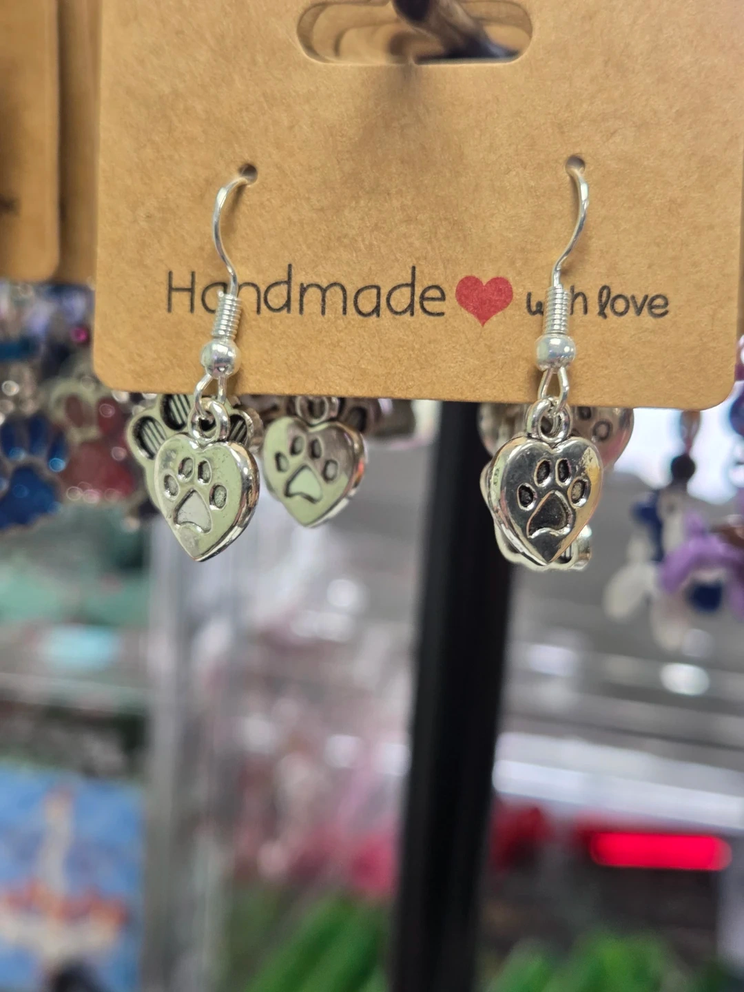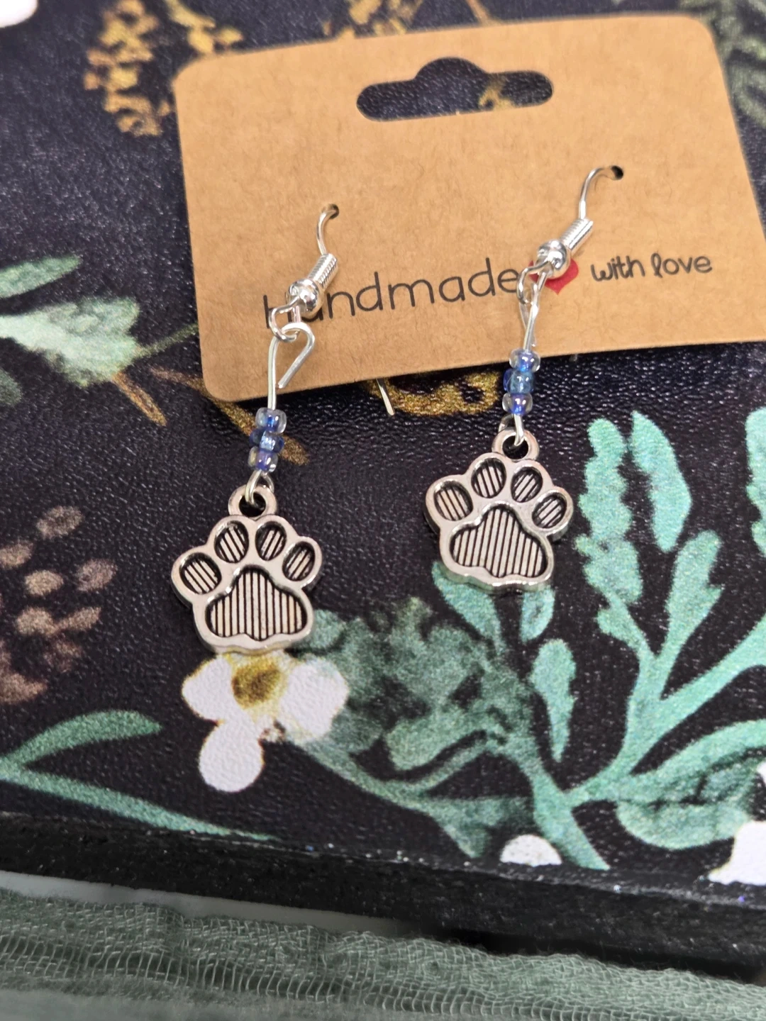 Handmade Paw Print Dangle Earrings with Blue Beads