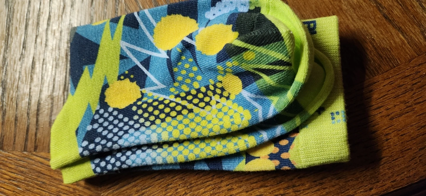 Comfortable crew socks with a vibrant abstract print. Features bright yellow, blue, and green colours with a modern dot pattern. Material is a soft blend.