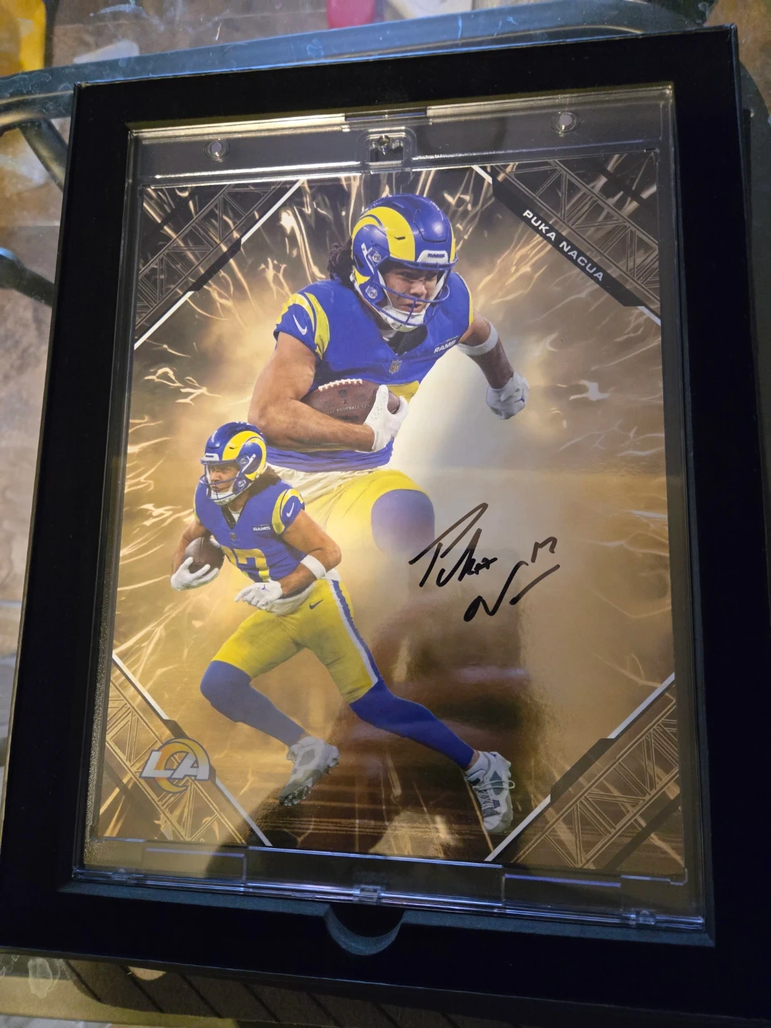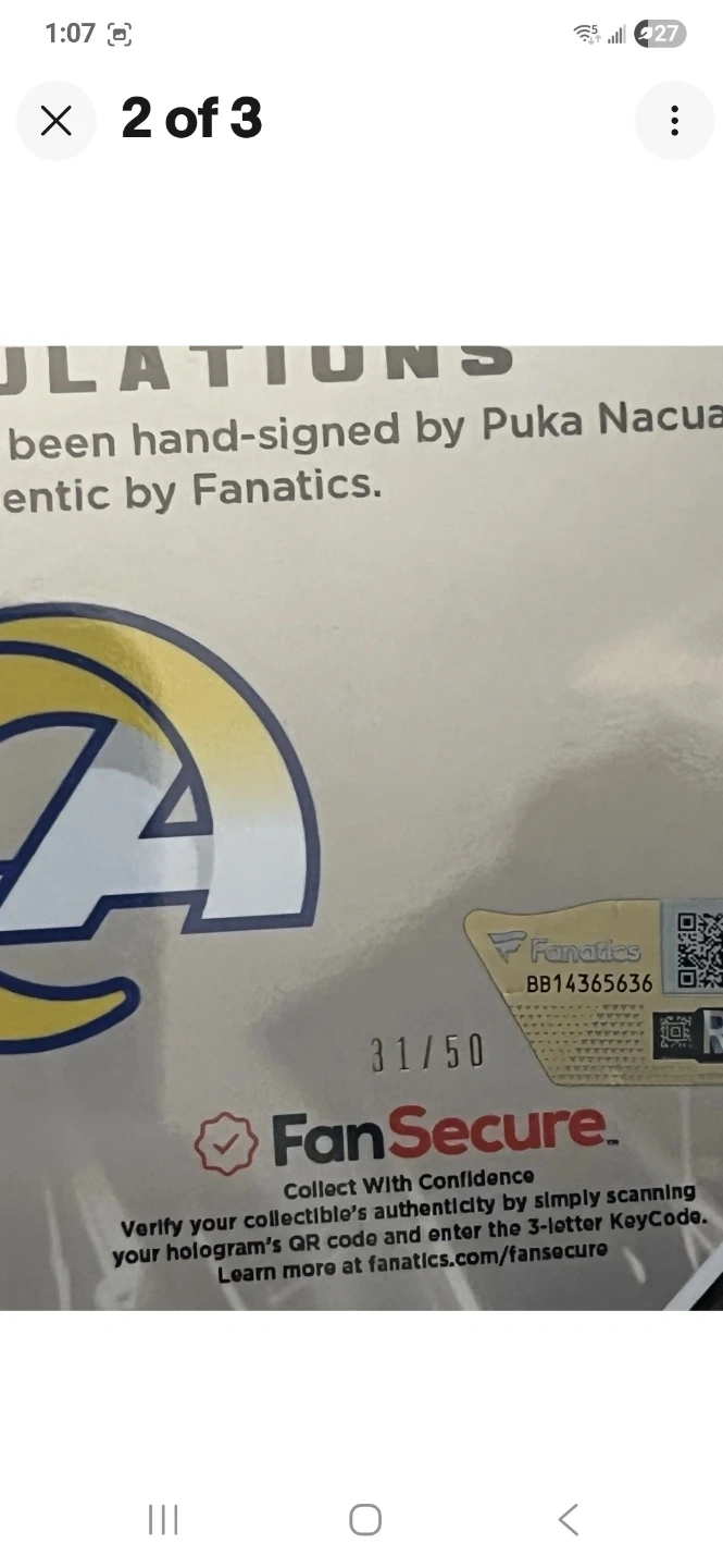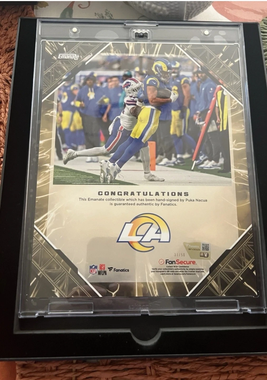 This Emanate collectible features a hand-signed Puka Nacua football card. It's part of a limited edition run, numbered 31 out of 50. Authenticated by Fanatics, this card is guaranteed to be genuine. This collectible is perfect for any avid football fan or collector.